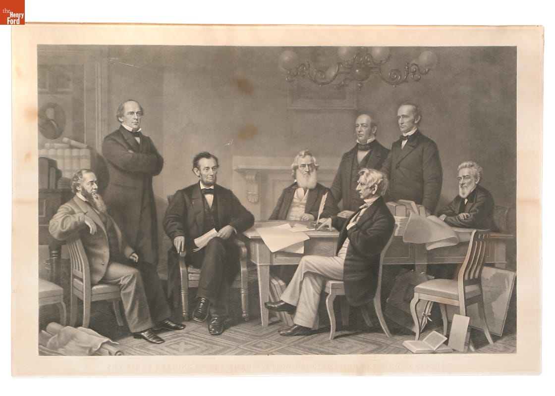 Following the American Civil War, this engraving commemorated a crucial event and became popular for classroom display across the country. It illustrates President Abraham Lincoln's first reading of the Emancipation Proclamation to his cabinet officers on July 22, 1862. Seated with papers in his lap, he is surrounded by the members of his cabinet. Text printed below the image identifies the men, left to right, as Edwin M. Stanton (Secretary of War), Salmon P. Chase (Secretary of the Treasury), President Lincoln, Gideon Welles (Secretary of the Navy), Caleb Smith (Secretary of the Interior), William H. Seward (profile, Secretary of State), Montgomery Blair (Postmaster General), and Edward Bates (Attorney General). Alexander Hay Ritchie engraved this large black-and-white print in 1866 based on the painting that Francis Bicknell Carpenter made in 1864 for display in the White House. For the many American abolitionists, the Emancipation Proclamation publicly announced by Lincoln in September 1862 to become law on January 1, 1863, was the essential first legal step in eliminating slavery throughout the United States. For the almost four million enslaved Americans, it gave them the hope of freedom and becoming equal citizens in the country they labored for so long to build and maintain.