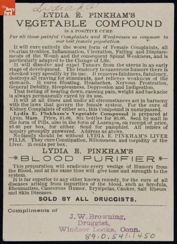 Trade Card for Lydia E. Pinkham's Vegetable Compound and Blood Purifier, 1889-1900