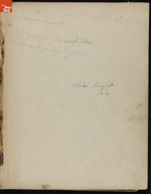 in pencil on first page: If my name you cannot find, Shut up your mouth / and never mind in pencil on first page: If my name you wish to see / Look on page eighty three / katie Wright / No. 4 in pencil on last page: Katie Wright