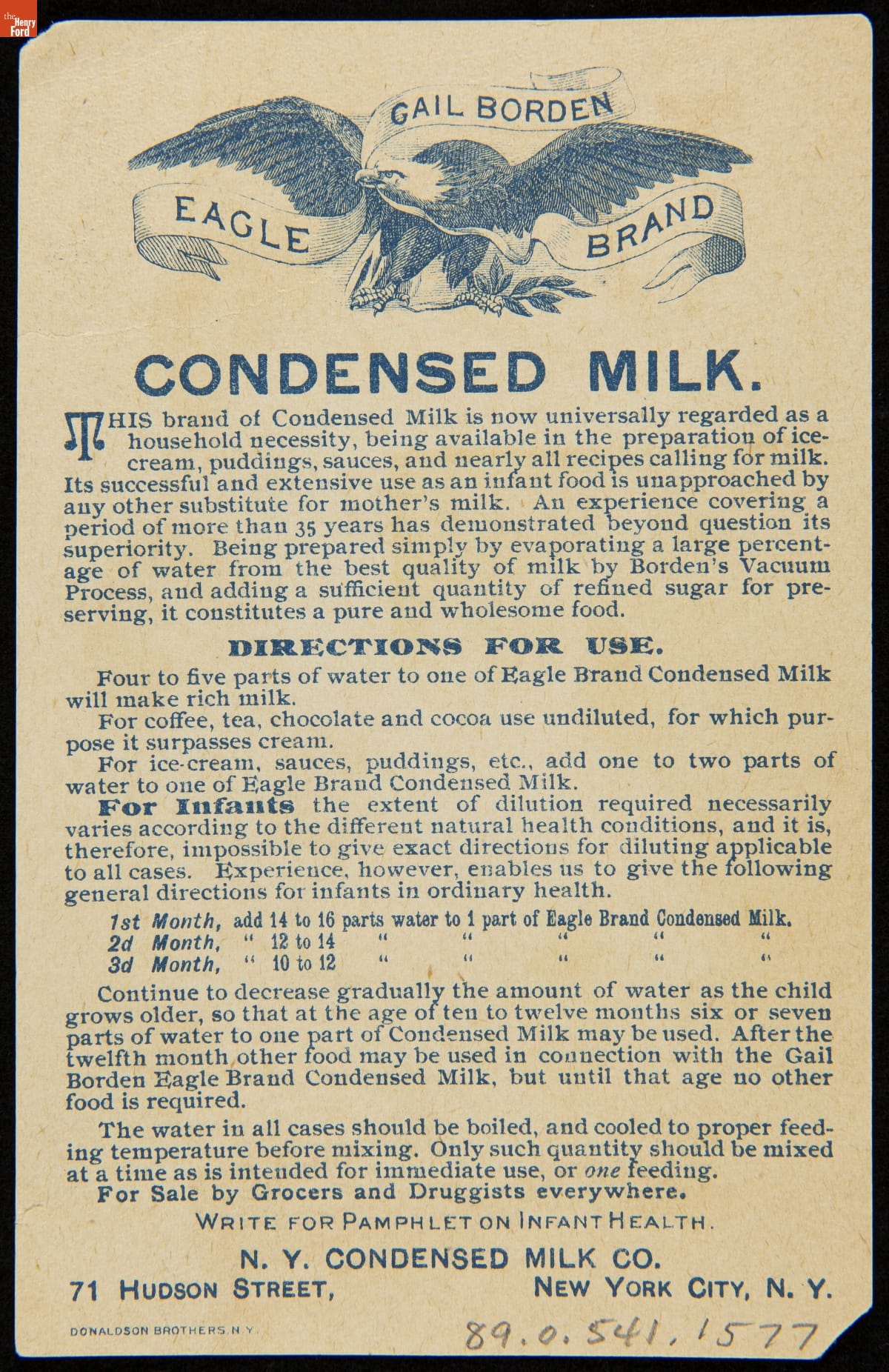 Feeding infants tainted cow's milk was a common cause of infant mortality. In 1856, Gail Borden introduced Eagle Brand Condensed Milk to combat this. This product became so popular for soldiers during the Civil War that, by the end of the war, it had gained a reputation for being safe, wholesome, and nourishing -- a trusted food for infants and children.