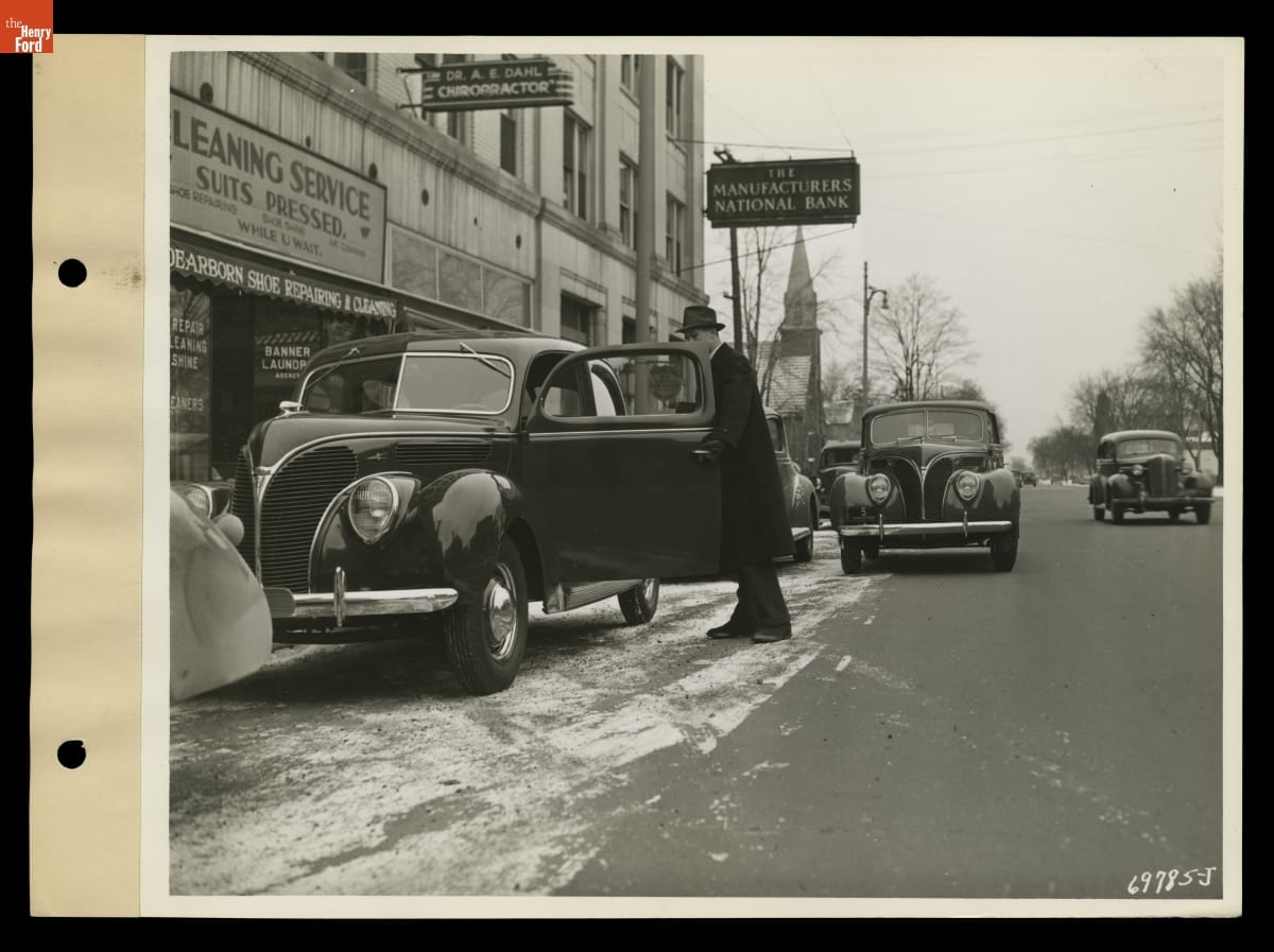 Man Standing beside a Ford V-8 DeLuxe Tudor Car Parked on a Commercial Street, Dearborn, Michigan, January 1938