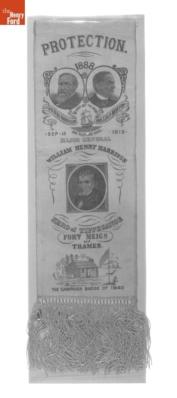 Front PROTECTION / 1888 / GEN. BENJ. HARRISON HON. LEVI. P. MORTON / WE HAVE MET THE ENEMY / AND THEY ARE OURS. / .SEP. 10. 1813 . / MAJOR GENERAL / WILLIAM HENRY HARRISON / HERO OF TIPPECANOE / FORT MEIGS / AND THAMES / THE CAMPAIGN BADGE OF 1840