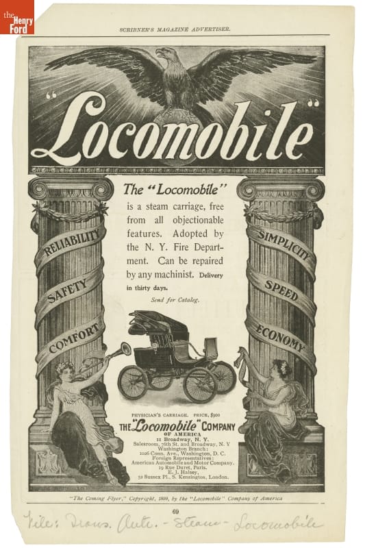 Printed from top of ad down: "Locomobile" / The "Locomobile" / is a Steam Carriage, Free / from all Objectionable / Features. Adopted by / the N.Y. Fire Depart- / ment. Can be repaired / by any machinist. Delivery / in 30 days. Delivery / in thirty days. / Send for catalog.