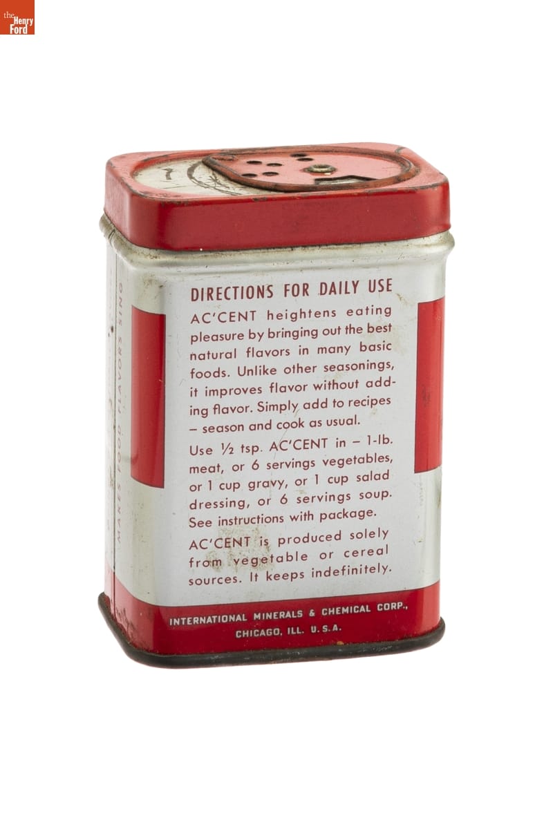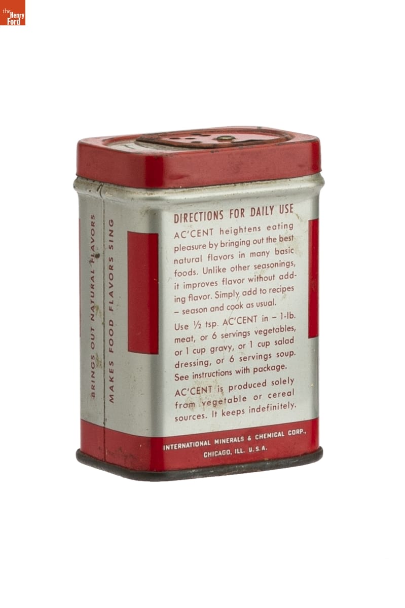 on front of can: NET WT. 1 OUNCE / Ac'cent(R) MAKES / FOOD FLAVORS SING / CRYSTALS OF 99+% PURE / MONOSODIUM GLUTAMATE / Produced by / Amino Products / Division / INTERNATIONAL MINERALS & CHEMICAL CORP., / CHICAGO, ILL., U.S.A. on back of can: DIRECTIONS FOR DAILY USE / AC'CENT heightens eating / pleasure by bringing out the best / natural flavors in many basic / foods. Unline other seasonings, / it improves flavor without add- / ing flavor. Simply add to recipes / - season and cook as usual. / Use 1/2 tsp. AC'CENT in - 1-lb. / meat, or 6 servings vegetables, / or 1 cup gravy, or 1 cup salad / dressing, or 6 servings soup. / AC'CENT is produced solely / from vegetable or cereal / sources. It keeps indefinitely. / INTERNATIONAL MINERALS & CHEMICAL CORP., / CHICAGO, ILL., U.S.A. on side of can: KEEP HANDY / WITH YOUR / COOKING SALT / AND PEPPER / REPLACEMENT OR REFUND OF MONEY / Guaranteed by / Good Housekeeping / IF NOT AS ADVERTISED THEREIN on side of can: BRINGS OUT NATURAL FLAVORS / MAKES FOOD FLAVORS SING