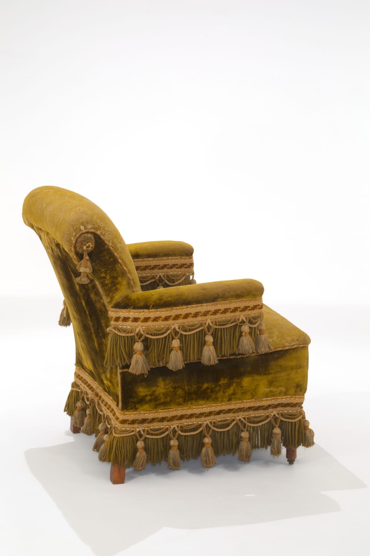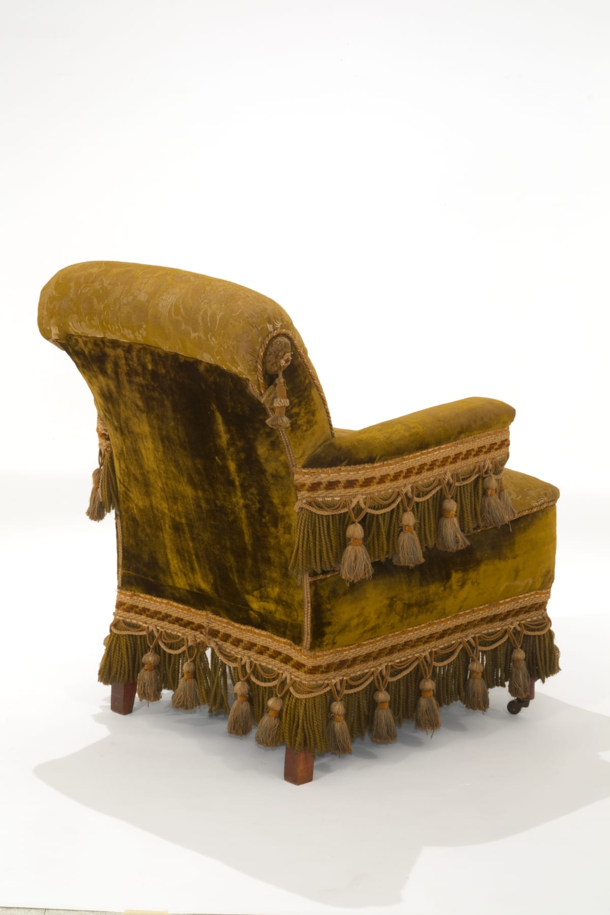 By the late 19th century, people could afford to buy a roomful of factory-made, designed-to-match furniture. This was reassuring for those uncertain of their decorating skills. Owning such pieces helped confirm one's social standing. This chair, part of a "Turkish" parlor set, reflects Americans' fascination with the exotic, especially the near and far east, although sets of this type were never made there.