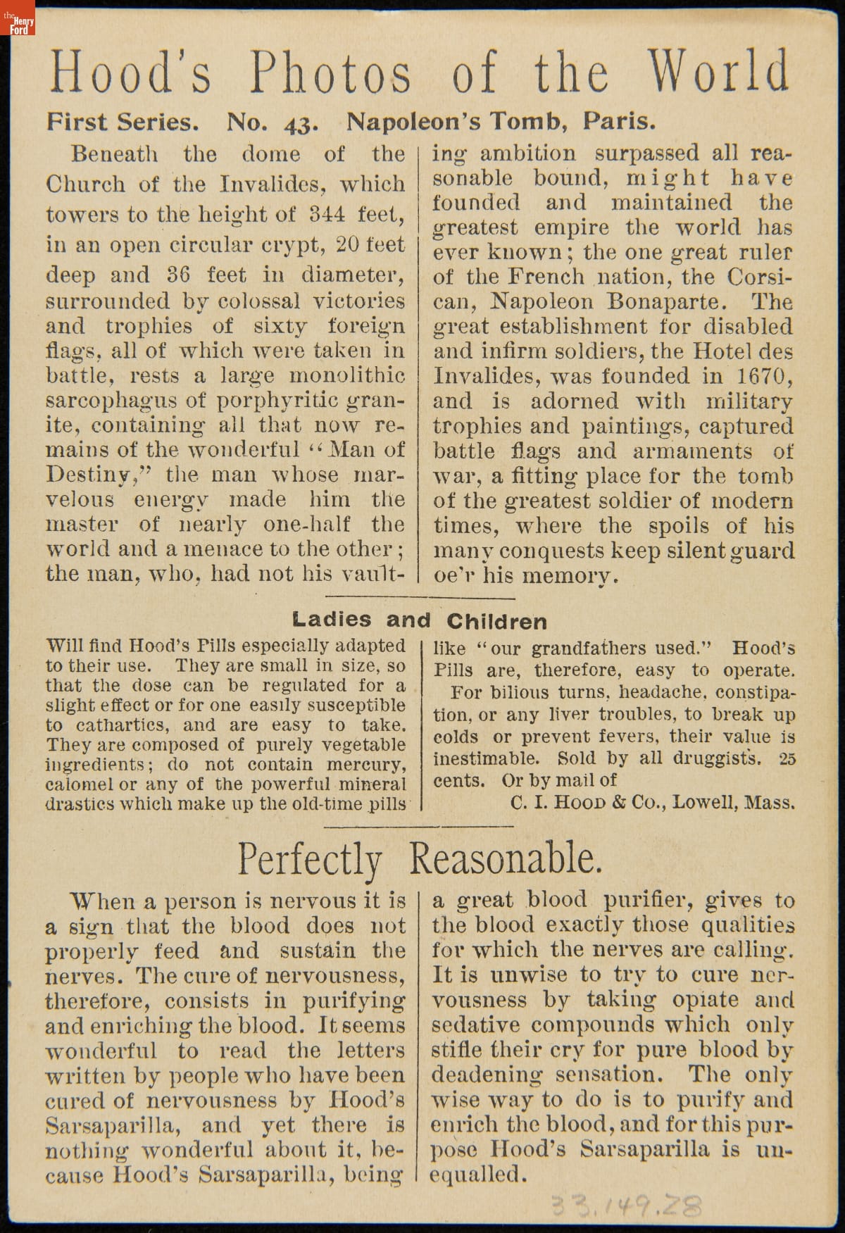 In the late 19th century, trade cards were a major means of advertising goods and services. Patent medicine producer, C.I. Hood & Co., had its own advertising department, creating cookbooks, calendars, and, most abundantly, trade cards. The trade card series, "Hood's Photos of the World," became popular among consumers, as it offered views of far-away places, providing a window to the broader world.