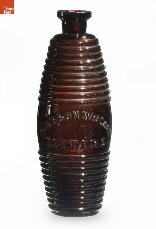Bitters is an herb-infused alcoholic mixture. Named for its bitter taste, the liquid was originally developed as a medicinal tonic to help soothe stomach complaints or other digestive disorders. During the late-19th and early-20th centuries, patent medicine dealers bottled and sold the elixir. Americans purchased bitters in simple mold-blown bottles or ones shaped like drums, barrels, or cabins.