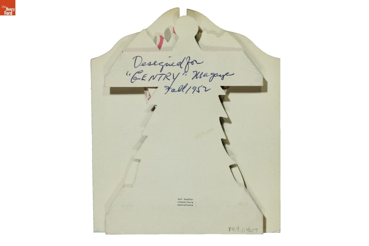Karl Koehler designed three-dimensional Christmas cards in the late 1940s and 1950s. He folded, scored, and snipped paper printed with his artwork, then assembled the cards in his studio. Koehler's creations folded flat for mailing, but when opened they brought unexpected joy with their pop-out shapes. Holiday shoppers found his line of "Mantelpiece" cards at high-end department stores throughout the country.