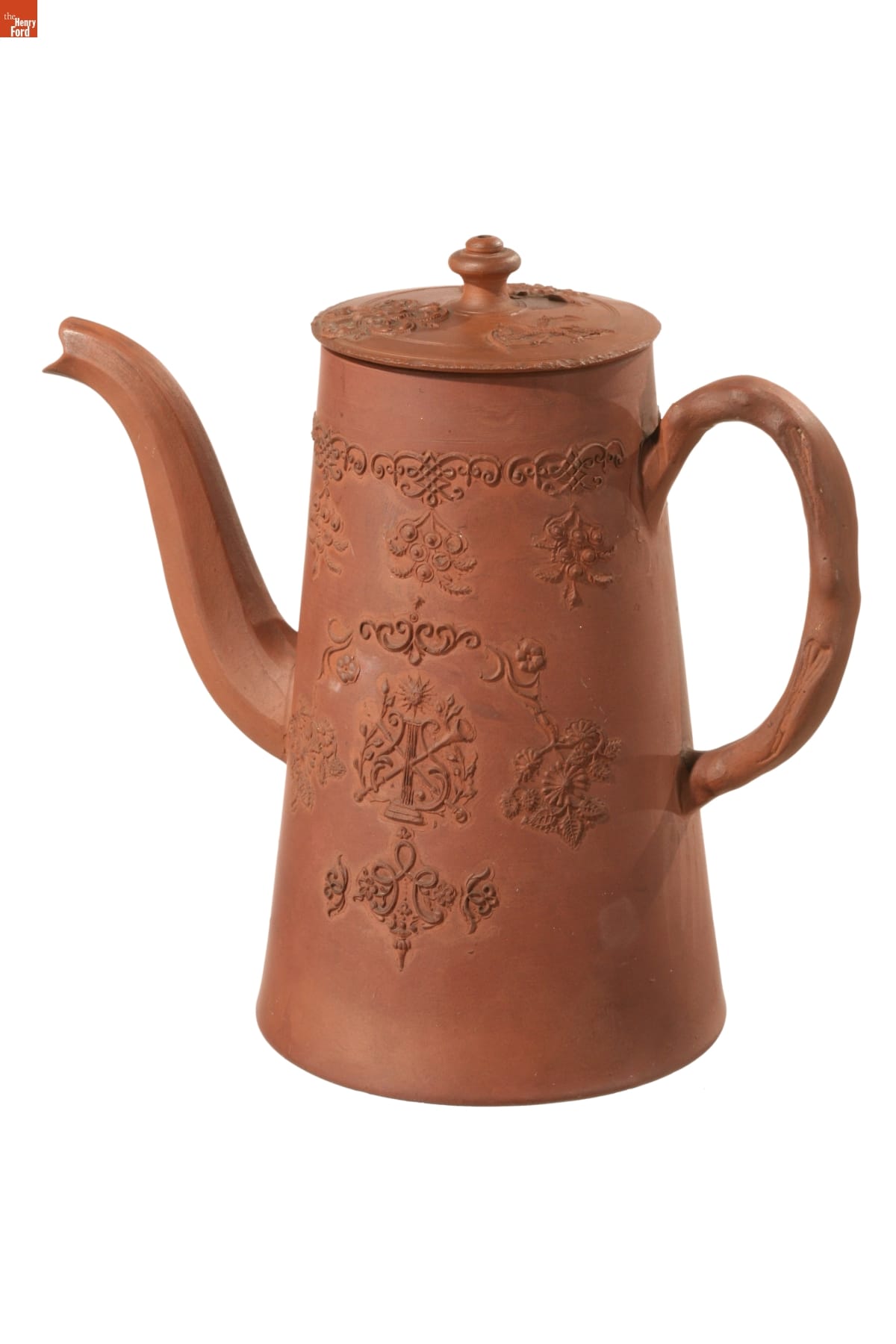 Colonial Americans consumed chocolate as a beverage. Drinkers combined the ground cacao beans -- imported from the West Indies -- with sugar, vanilla, and water and served the hot beverage in distinctly-shaped chocolate pots, like this late 1700s example. The lighthouse shaped form derived from Chinese export tea and coffee pots and the surface decoration from fashionable rococo designs.