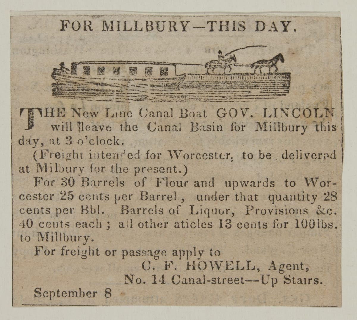 The first half of the 19th century was the heyday of canals in the United States, providing easier access to territories for settlement and commerce. This newspaper advertisement, published September 9, 1829, for the canal boat Gov. Lincoln of the Massachusetts Canal, notified the public of the date and time for departure, along with freight and passage rates.