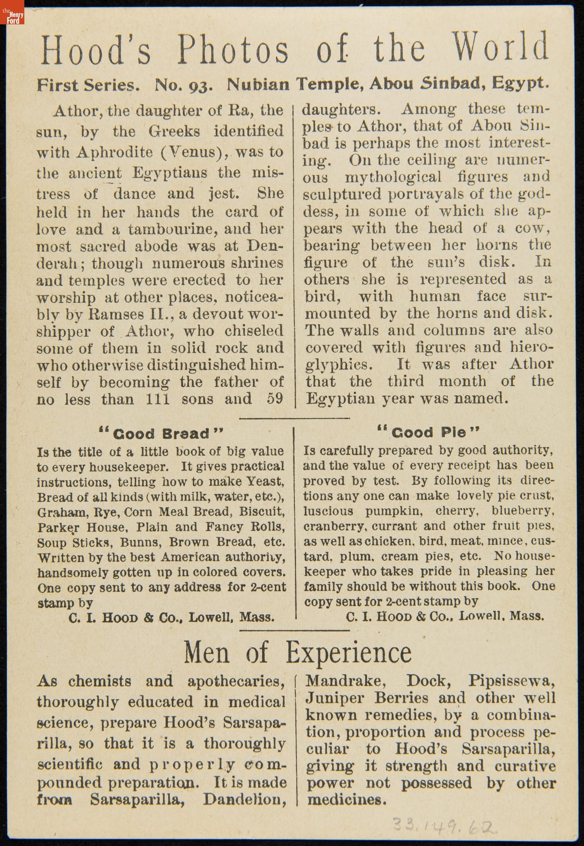 In the late 19th century, trade cards were a major means of advertising goods and services. Patent medicine producer, C.I. Hood & Co., had its own advertising department, creating cookbooks, calendars, and, most abundantly, trade cards. The trade card series, "Hood's Photos of the World," became popular among consumers, as it offered views of far-away places, providing a window to the broader world.