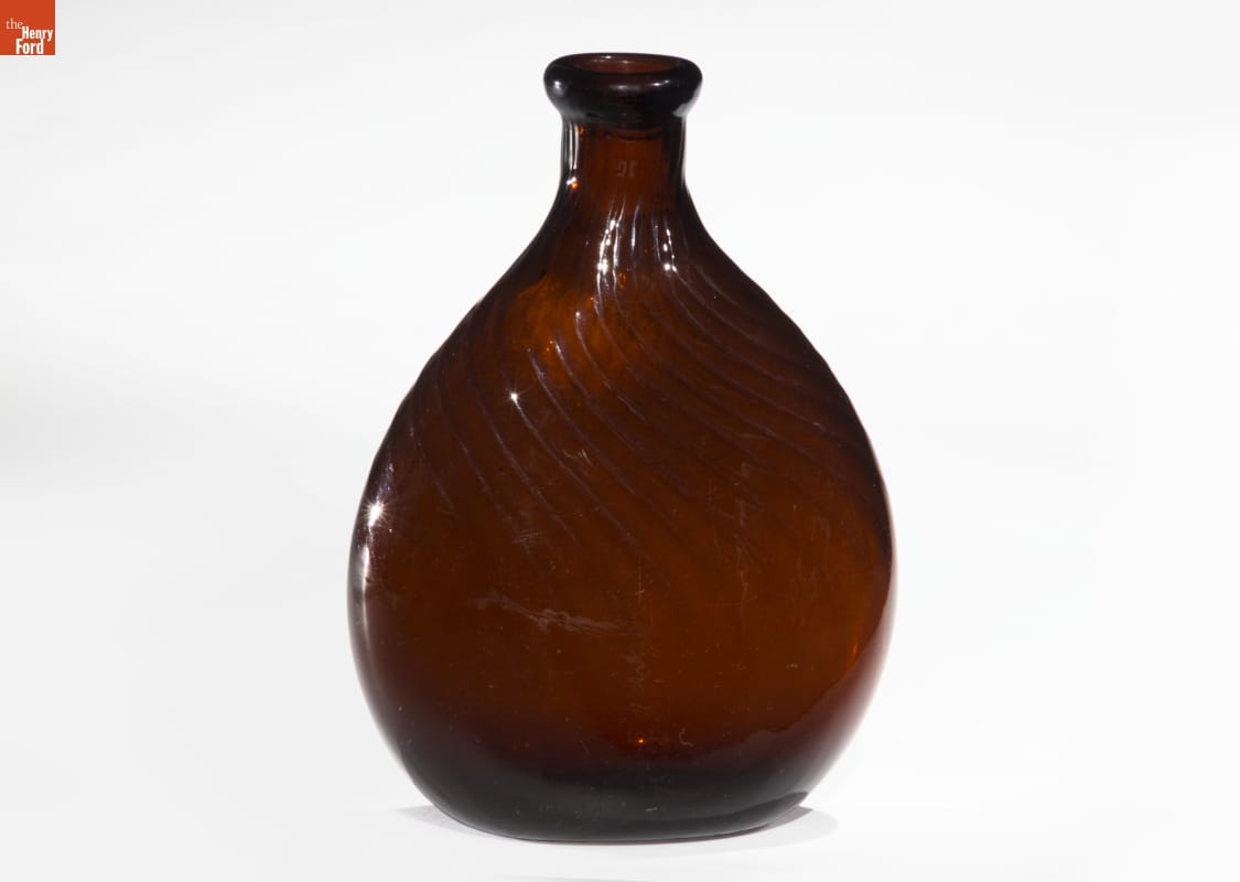 American glass factories produced flasks, like this one, from the late 1700s well into the mid-1800s. The pint-sized flask could hold water but more likely contained alcoholic beverages. Its textured decorative exterior -- formed when the hot glass was dipped into a pattern mold before it was blown -- made the flask easier to grasp. And its flattened shape fit nicely into pockets providing ready access to the liquid refreshment.