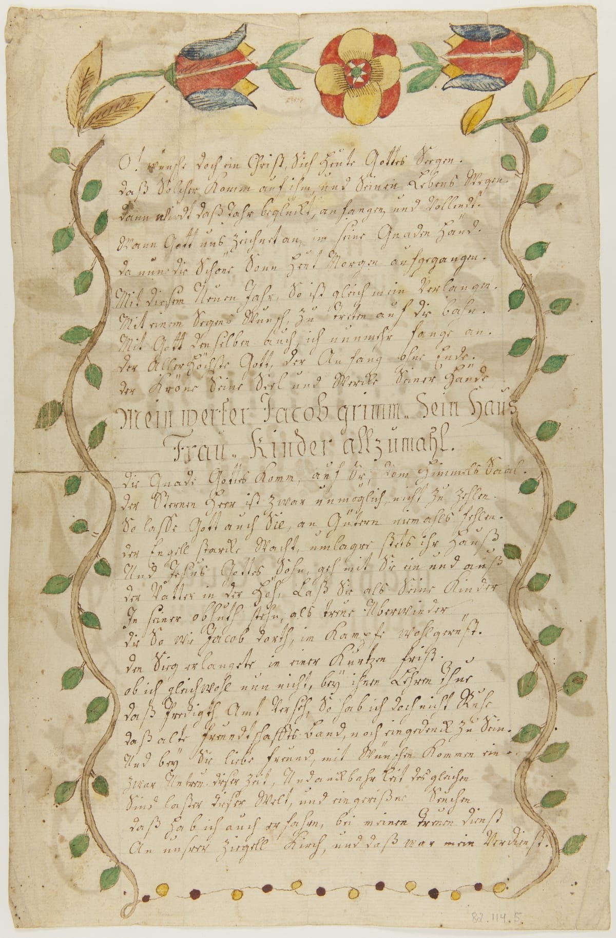 Early German immigrants created decorative documents, known as fraktur, for a variety of reasons. Many commemorated a child's birth and baptism. Others were made as keepsakes, symbols of achievement or expressions of the immigrant's heritage or religion. Jacob Grimm received this New Year's greeting from Daniel Schumacher, the minister at his church. The pastor embellished his greeting with an angel and a border of colorful flowers.