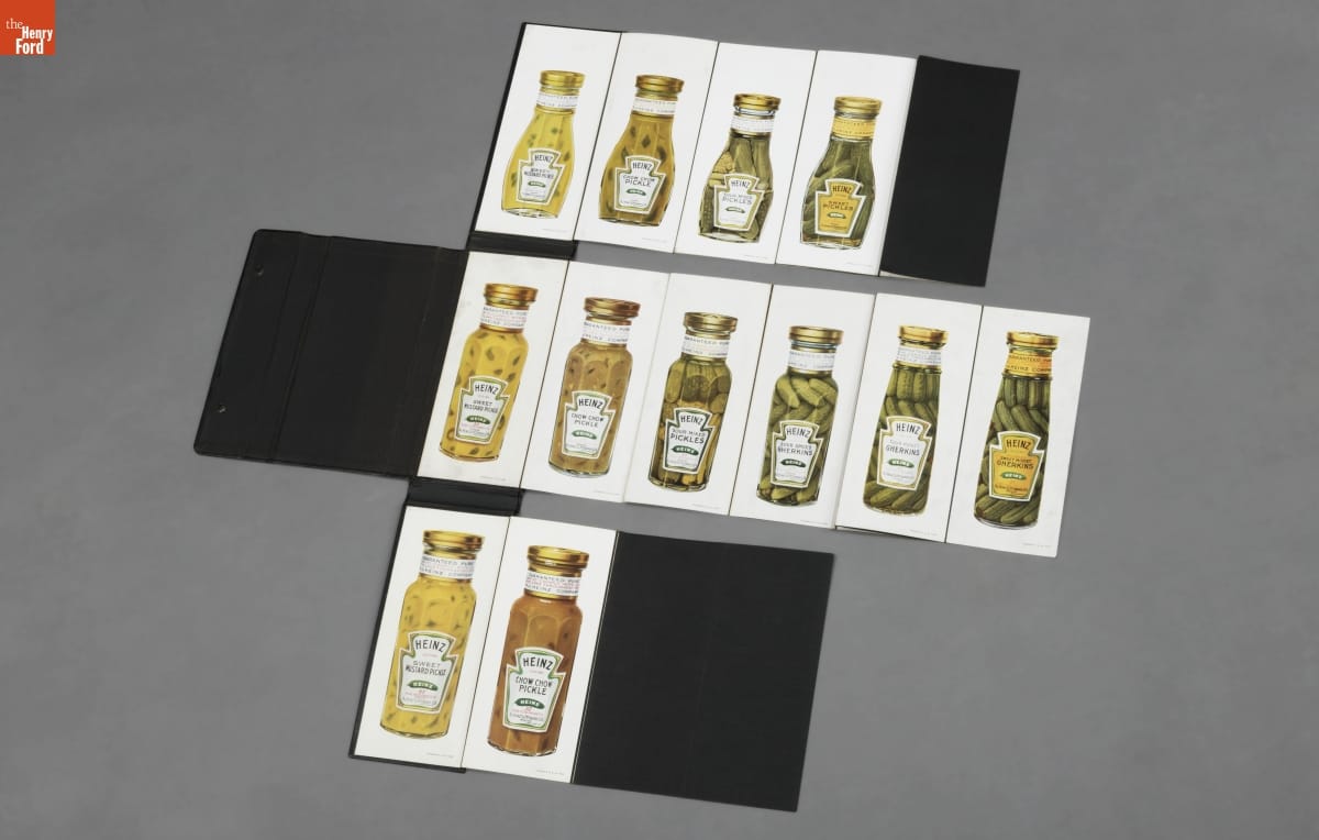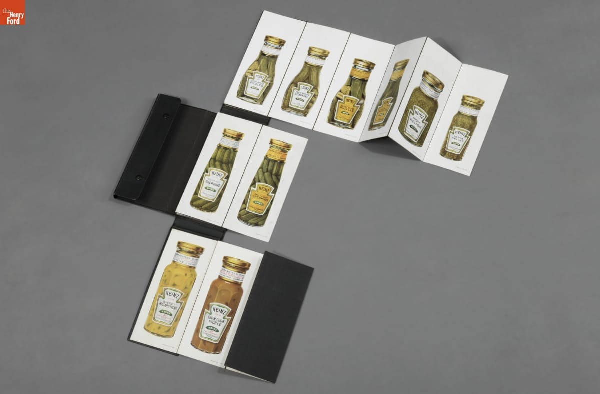 With many varieties of pickles and condiments that the company sold, a Heinz salesperson relied on a kit with fold-out cards to present the products to potential customers. Whether selling to store owners or peddling to residents in their homes, the kit allowed salespeople to show a variety of products without physically carrying them.