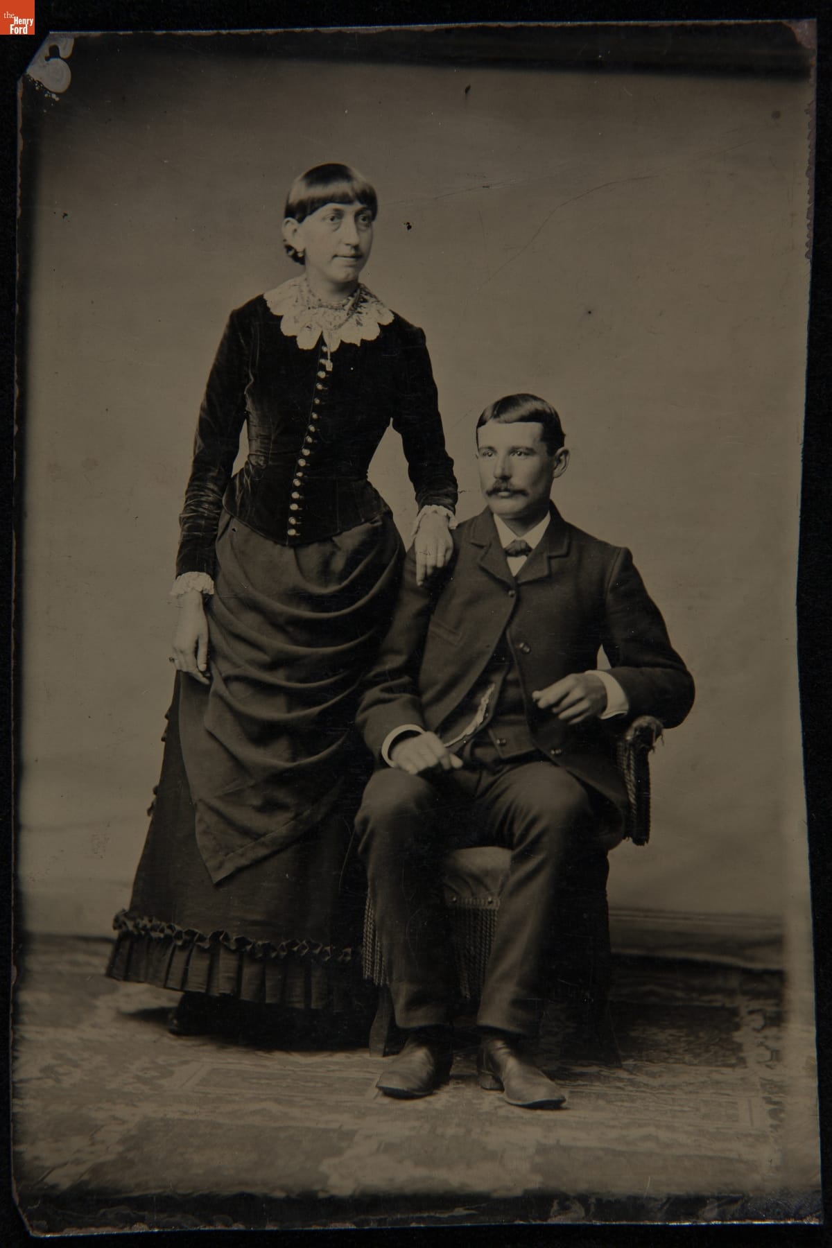 Wife with Lace Collar and Cuffs and Her Seated Husband, circa 1885
