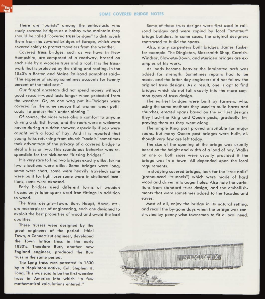 In the days before weatherproofed lumber, siding and a roof protected a wooden bridge's truss system and kept its structural timbers dry. Despite this purely practical design, covered bridges had nostalgic appeal. Decades after their utility faded, tourists sought out surviving examples. Some states featured covered bridges in marketing campaigns, erected signage, and developed tours to facilitate sightseeing.