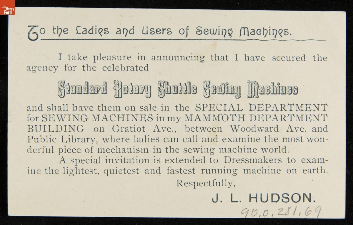 As color printing gained momentum in the late 19th century, trade cards became a major means of advertising goods and services. Americans enjoyed and often saved the little advertisements found in product packages or distributed by local merchants. This trade card advertises the Standard Sewing Machine Company.