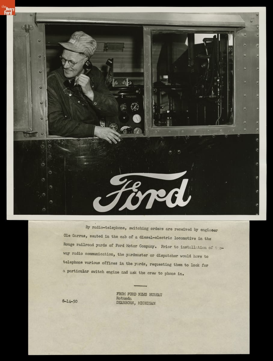 Engineer Ole Garras Receiving Switching Orders by Radio/Telephone, Ford Motor Company Rouge Plant Railroad Yard, August 1950