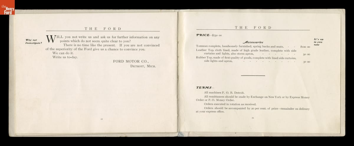 Henry Ford wanted to create a light-weight, low-priced vehicle. His automobile would be uncomplicated, able to traverse American roads, and affordable to average Americans. The Ford Motor Company's first vehicle -- simple and inexpensive -- is seen headed to the moon on the cover of this 1903 catalog. Ford, however, was not satisfied and continued to improve and innovate.