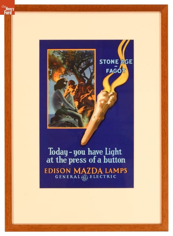 General Electric promoted its bright, long-lasting Edison Mazda light bulb through an advertising campaign featuring illustrations by artists including Maxfield Parrish and Norman Rockwell. Advertisements depicting the history and power of light ran in popular magazines like The Saturday Evening Post and Ladies' Home Journal. The images were also reproduced for point-of-purchase materials and posters like this one.