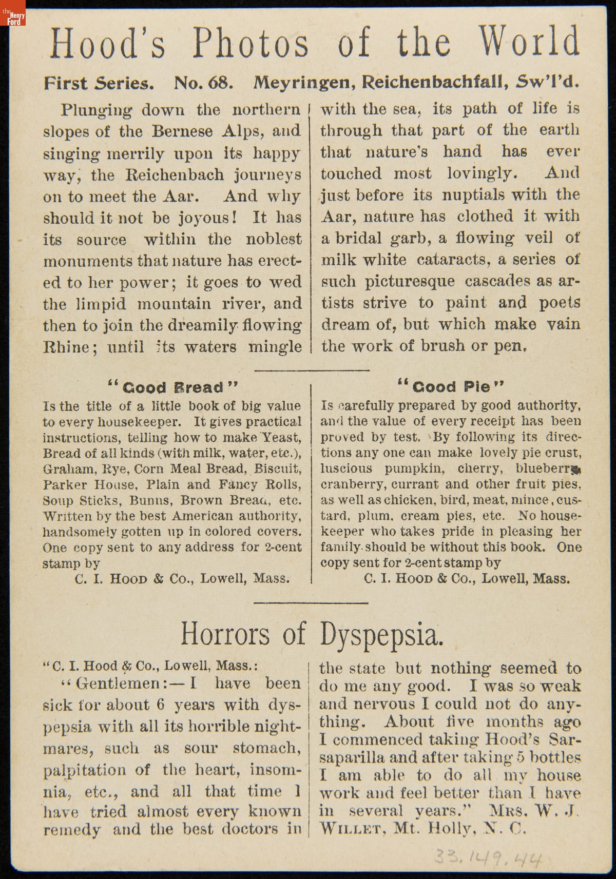 In the late 19th century, trade cards were a major means of advertising goods and services. Patent medicine producer, C.I. Hood & Co., had its own advertising department, creating cookbooks, calendars, and, most abundantly, trade cards. The trade card series, "Hood's Photos of the World," became popular among consumers, as it offered views of far-away places, providing a window to the broader world.