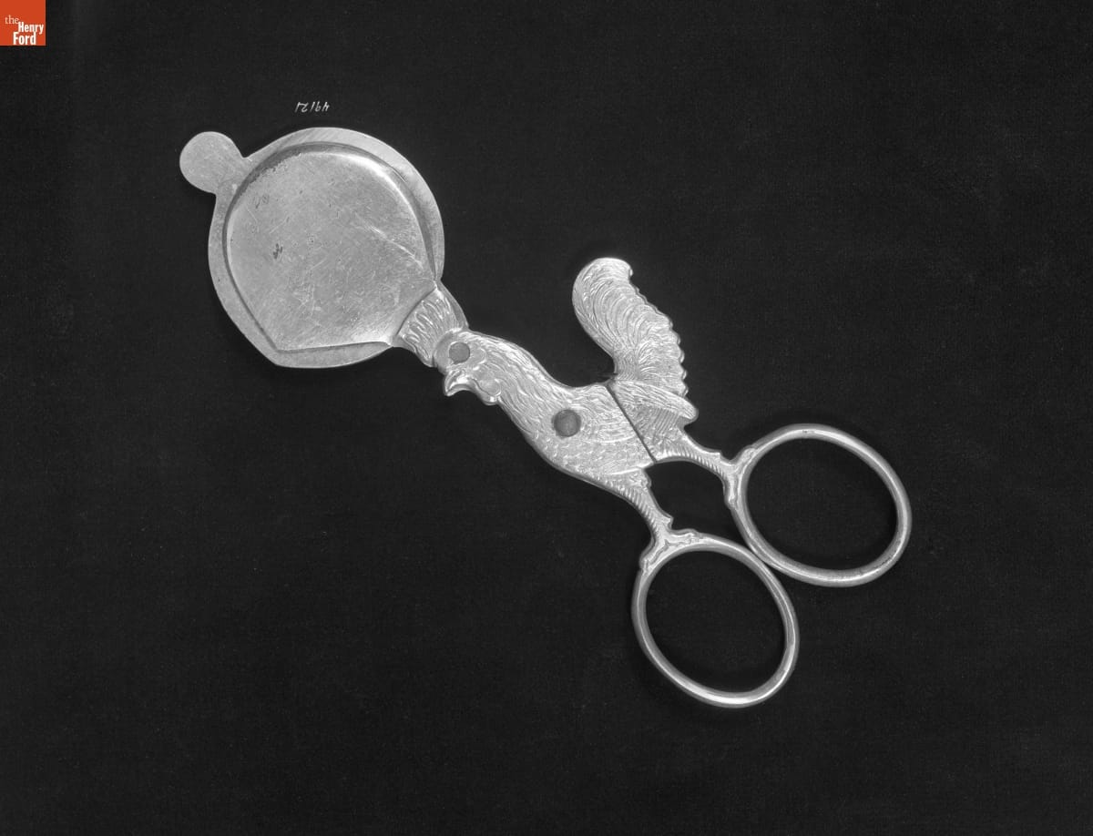 Decorative--and useful--this chicken-themed egg slicer was used for soft-boiled eggs served at the breakfast table. Scissor-like, it cut through shells to remove the top of the eggs as they stood upright in egg cups. Soft-boiled eggs delivered tender egg whites and liquid yolks.