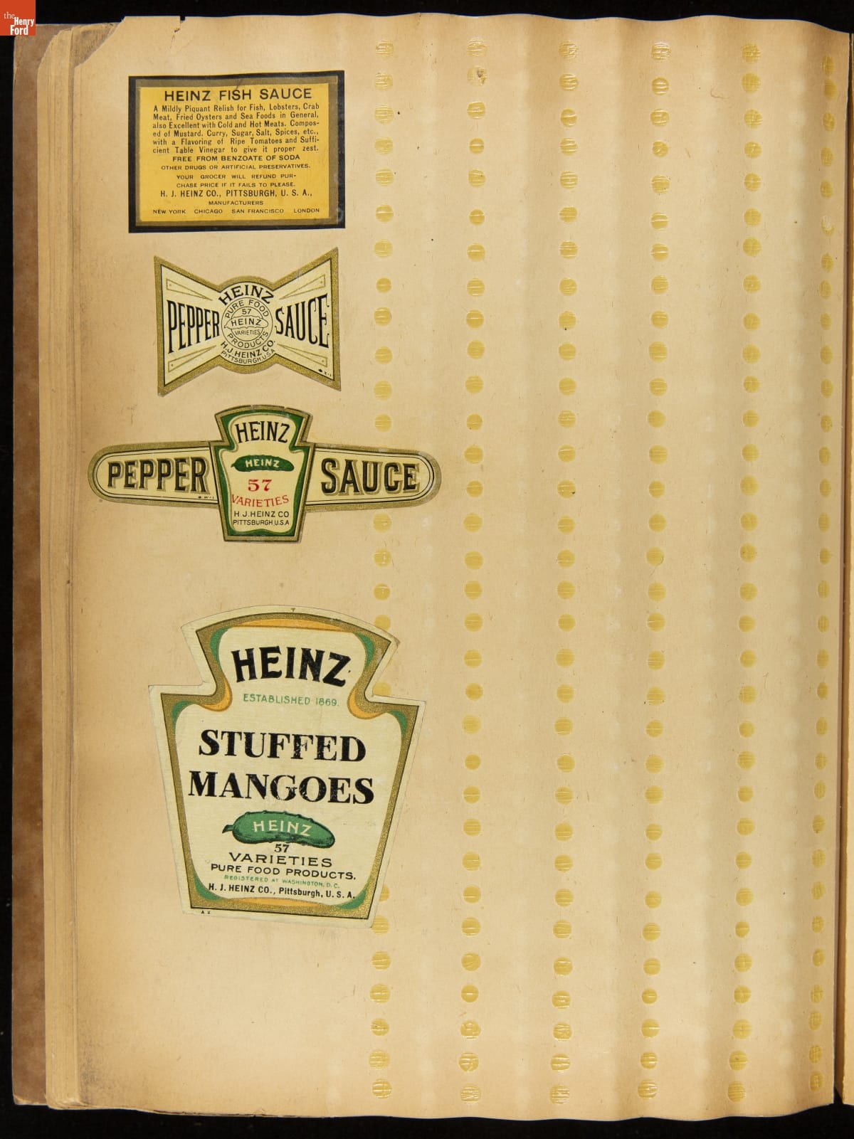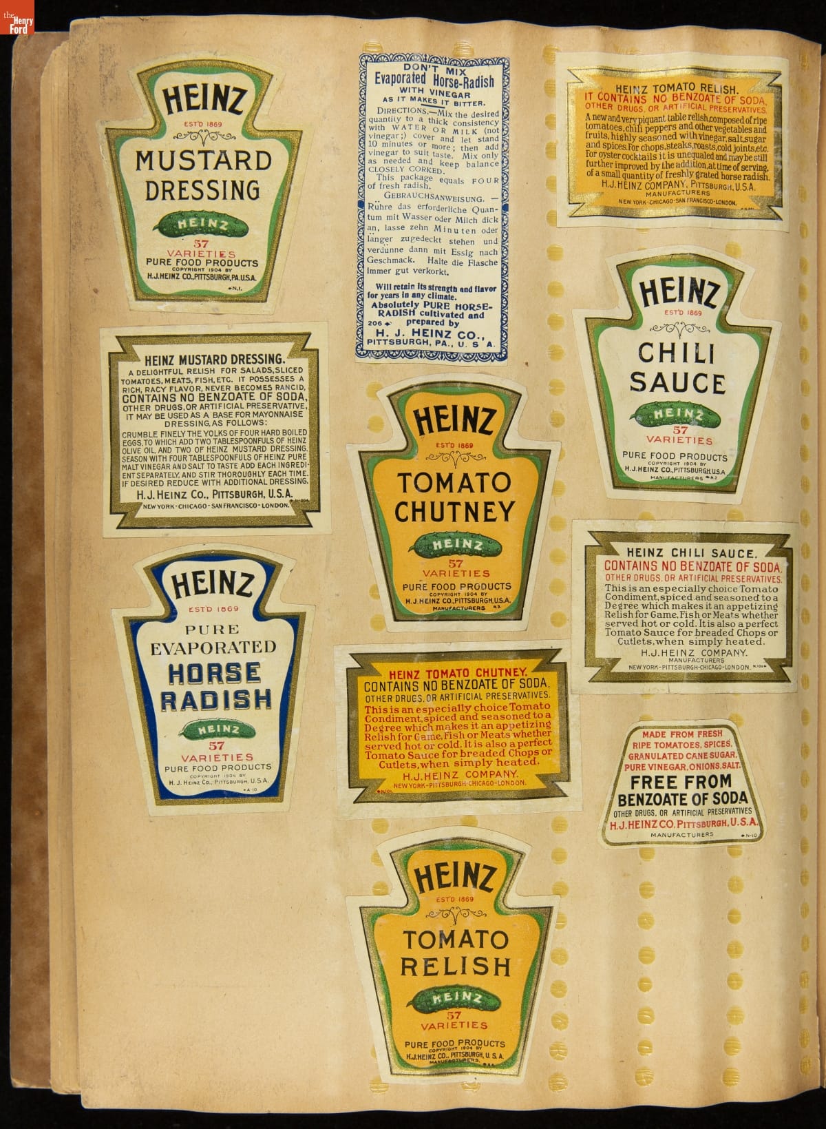 While "57 Varieties" became the well-known slogan for the H.J. Heinz Company, it actually produced more than 60 different products. This scrapbook provides a glimpse of some labels for the products produced by Heinz in the early twentieth century.