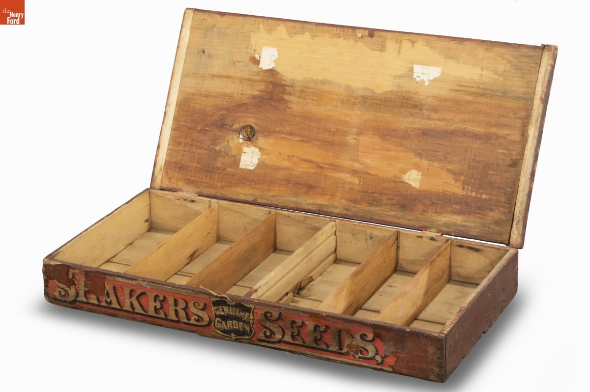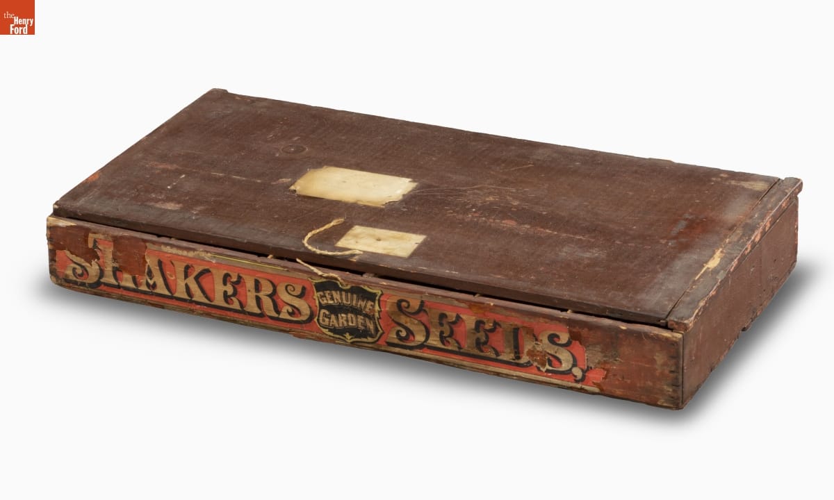 Shakers at Watervliet, N.Y., produced seeds for resale by 1790 and first sold paper packets of seeds in 1835. Yet, the Mt. Lebanon, N.Y. community dominated the Shaker seed business from the 1860s to 1891. They made wooden boxes like this one, packed them with "genuine" Shaker seeds, delivered the boxes to general stores for resale, and collected and restocked the boxes for the next growing season.