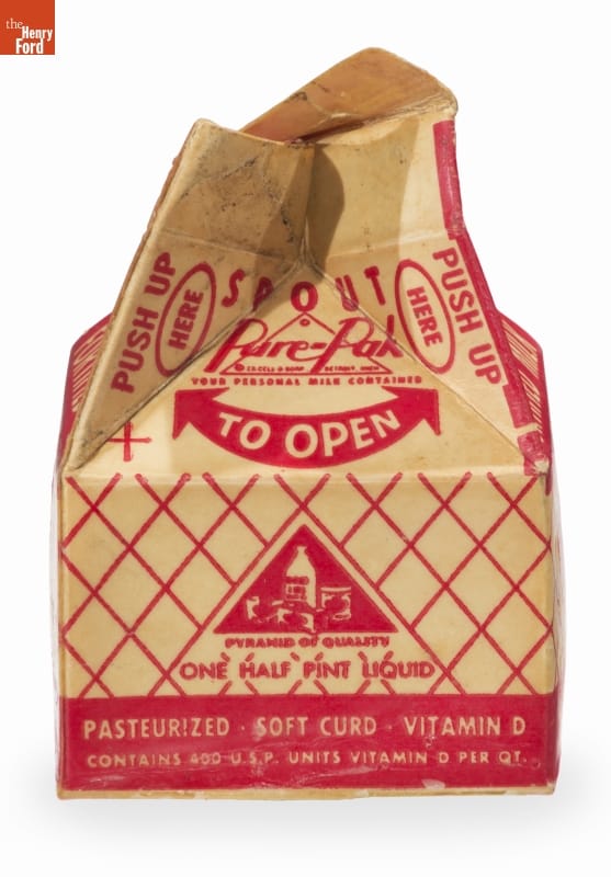 on proper left and right sides: MONDAY / TO BE SOLD BY MIDNIGHT OF DAY STAMPED ABOVE / WILSON'S MELLO-D HOMOGENIZED FORTIFIED MILK / WILSON'S QUALITY / IRA WILSON & SONS DAIRY CO. / 5255 TILLMAN AVENUE DETROIT on front: SPOUT PURE-PAK / (c) IR-[?] & SONS DETROIT MICH / YOUR PERSONAL MILK CONTAINER / TO OPEN / PYRAMID OF QUALITY / ONE HALF PINT LIQUID / PASTEURIZED SOFT CURD VITAMIN D / CONTAINS 400 U.S.P. UNITS VITAMIN D PER QUART