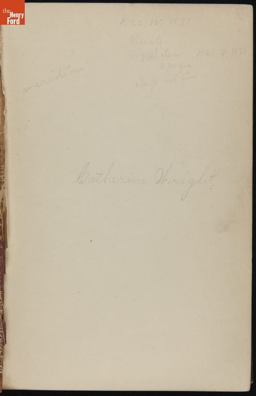 in pencil inside front cover: Katharine Wright / K. Wright 9 Hawthorn in pencil on first page: Dec. 15, 1893 / Webster / Webster, Dec. 8, 1893 / 2 pages / skip a line / Catharine [sic] Wright