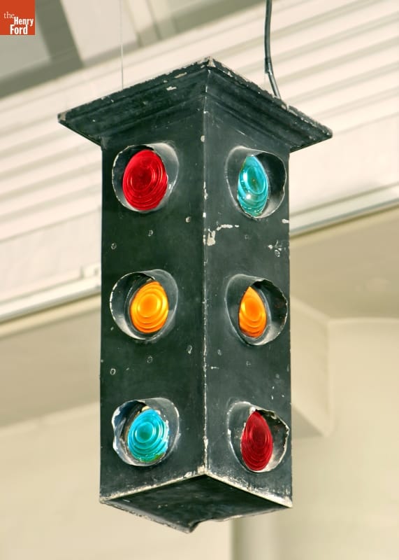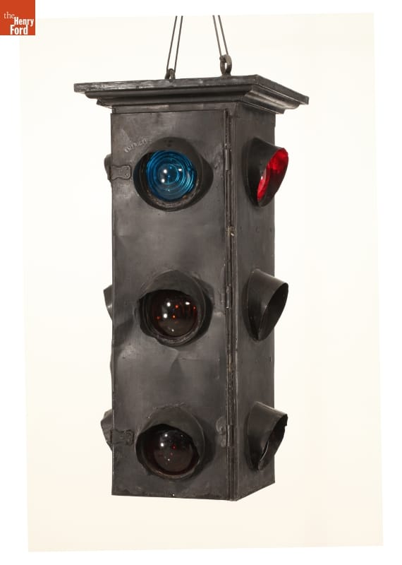 Detroit traffic officer William Potts created this three-color, four-way traffic signal in 1920. Previous illuminated signals used only red and green lights. The addition of an amber "caution" light made driving safer and the three-color signal became the standard by the mid-1930s. This first traffic light was installed at Woodward Avenue and Fort Street in Detroit, Michigan.