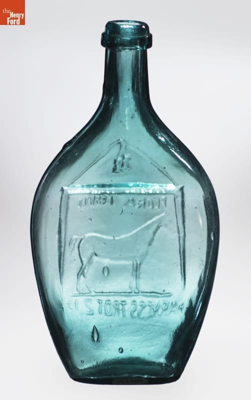 Glass factories in America began producing inexpensive, mold-formed flasks in the early 1800s. Many figured flasks were decorated with symbols of national pride and images of famous individuals -- or in this case a famous racehorse. Flora Temple won 95 harness races during the 1850s and 1860s. Not only was this "bob-tailed" mare immortalized in glass, but also in the song "Camptown races."