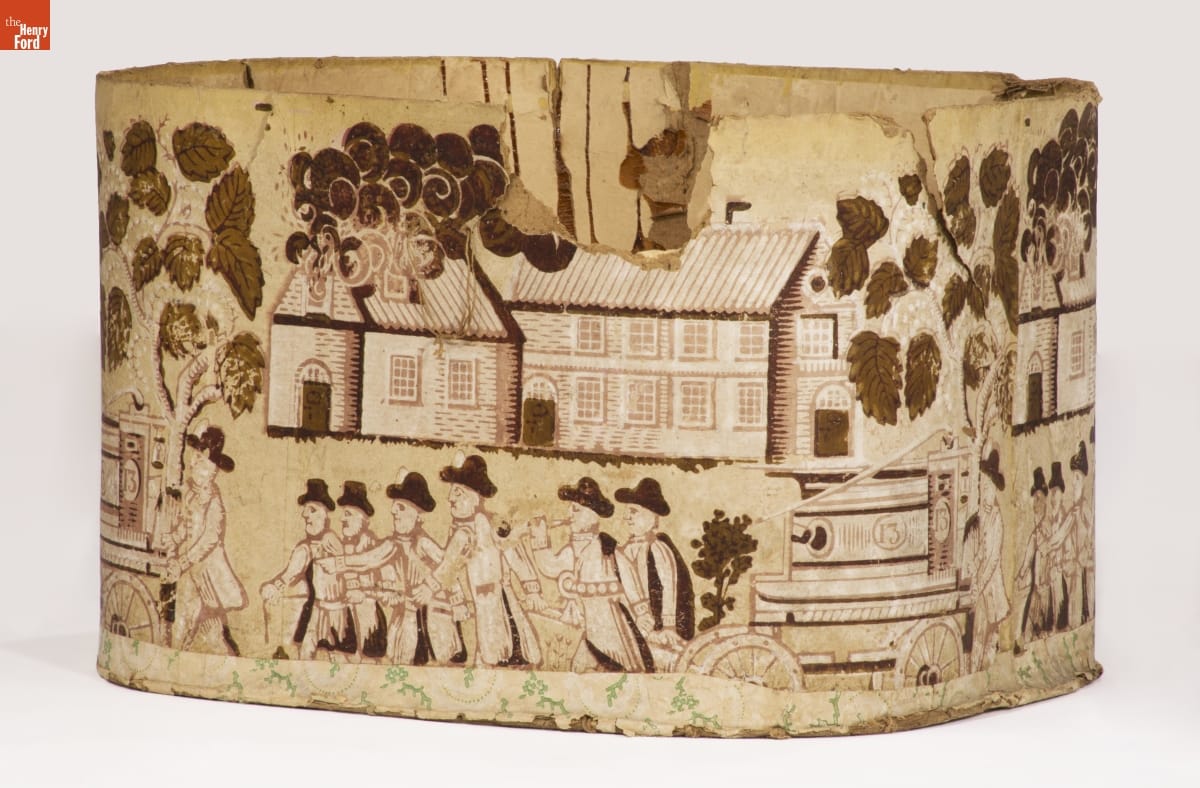 In the early 1800s, Americans used bandboxes to store clothing, accessories, and other small items. Bandboxes were handy containers in the home or when traveling by stage, boat, or rail. Manufacturers covered these inexpensive pasteboard or wooden boxes with colorful papers. This bandbox's paper depicts a scene of a New York City volunteer fire department using its new engine.