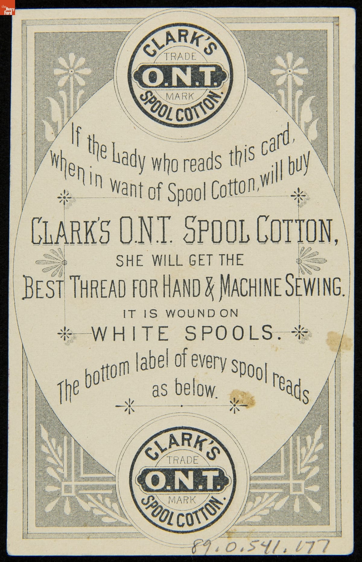Trade Card for Clark's Spool Cotton, Clark's O.N.T., 1880-1890