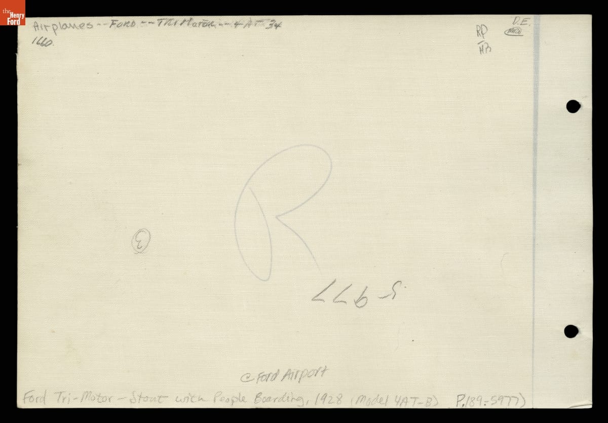 Model 4-AT airliners were designed and built by engineers of the Stout Metal Airplane Company, purchased from William Stout by Ford Motor Company. These rugged planes earned a reputation for being safe and dependable. Many commercial airlines -- including Stout's newly formed Stout Air Lines -- purchased 4-ATs for passenger travel. Here, one of his airliners takes on well-dressed passengers in Dearborn, Michigan.