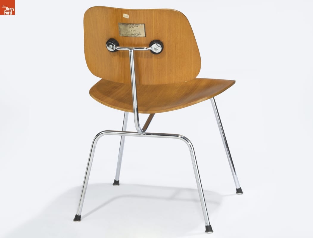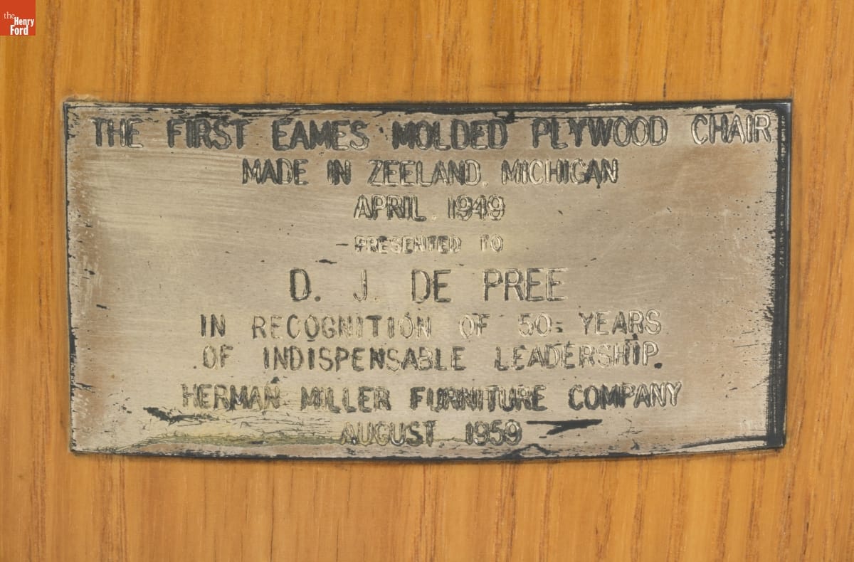 plaque on back: THE FIRST EAMES MOLDED PLYWOOD CHAIR / MADE IN ZEELAND, MICHIGAN / APRIL 1949 / PRESENTED TO D. J. DE PREE / IN RECOGNITION OF 50 YEARS OF INDISPENSABLE LEADERSHIP / HERMAN MILLER FURNITURE COMPANY / AUGUST, 1959