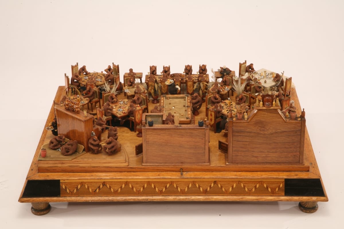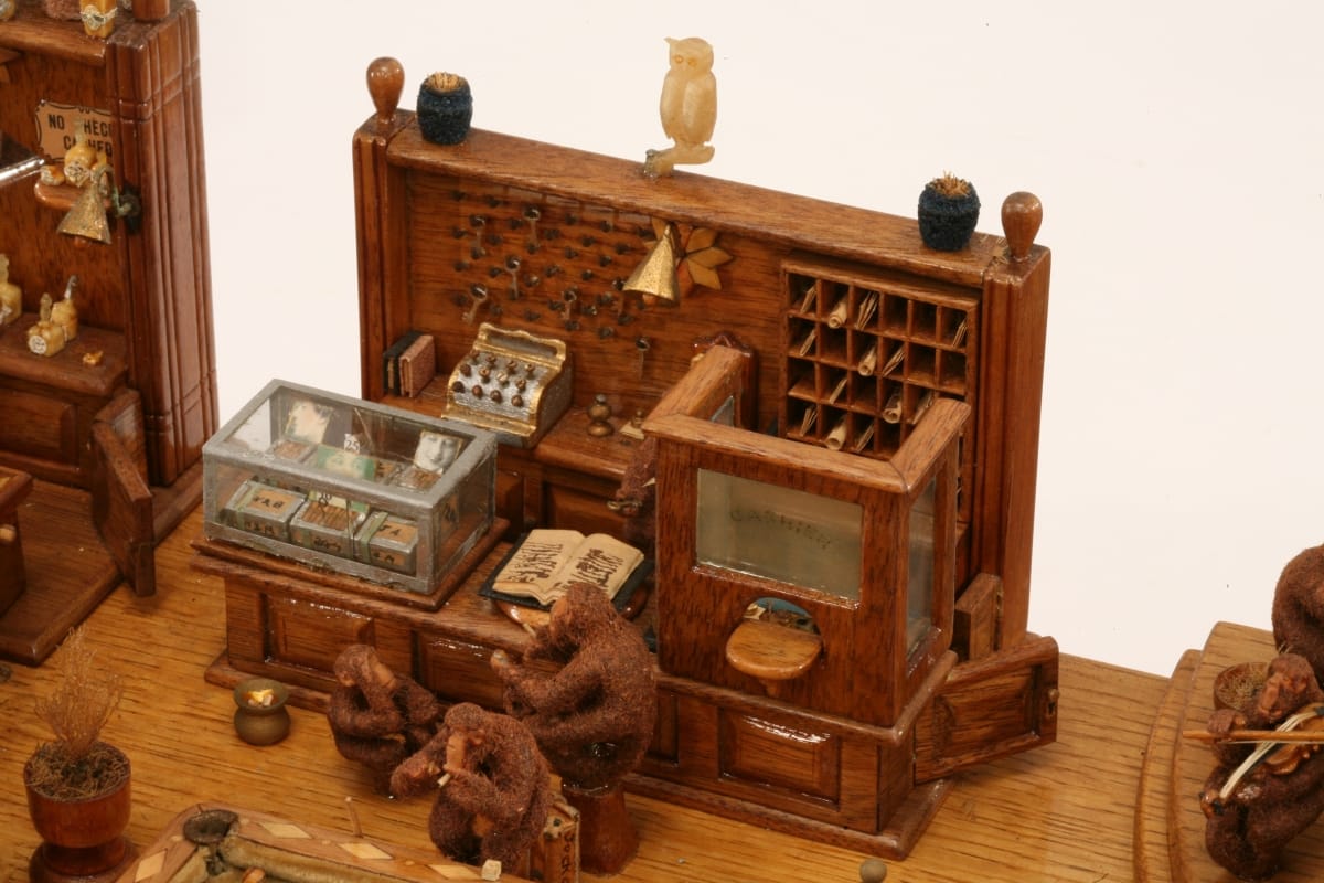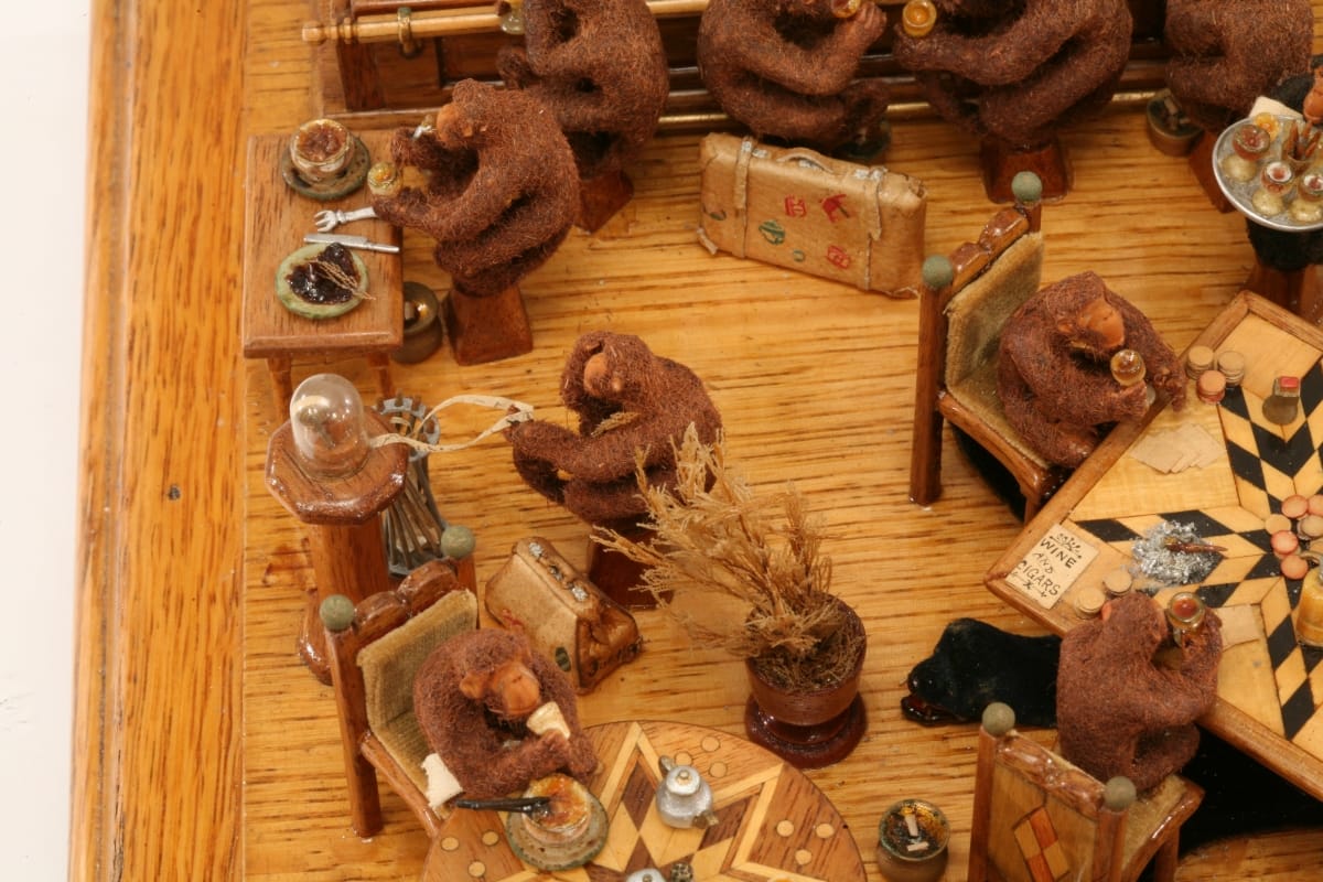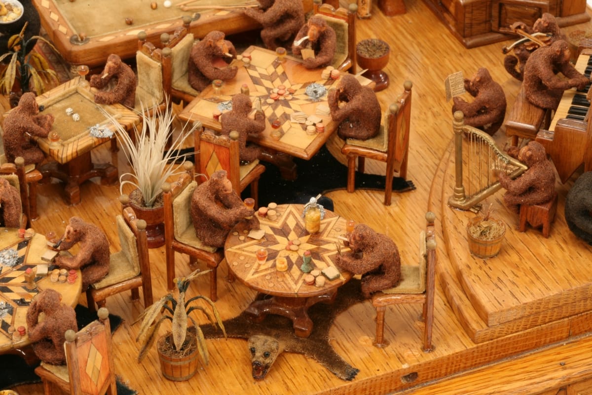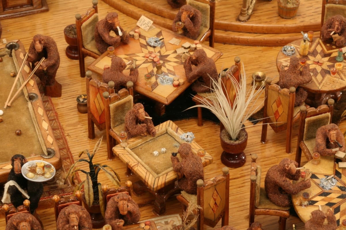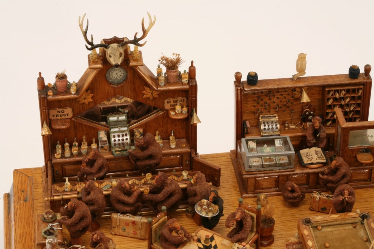 In 1915, Patrick J. Culhane, an inmate at the Massachusetts State Prison, presented this diorama to Henry Ford. Culhane depicted monkeys engaging in activities he believed lead to the downfall of many prisoners, such as gambling and drinking alcohol. Ford, interested in the man who produced this elaborate work, probably secured Culhane's release and gave him a job at the Ford assembly plant in Cambridge, Massachusetts.