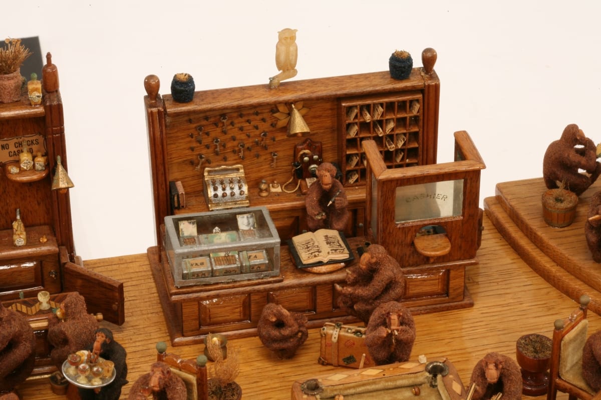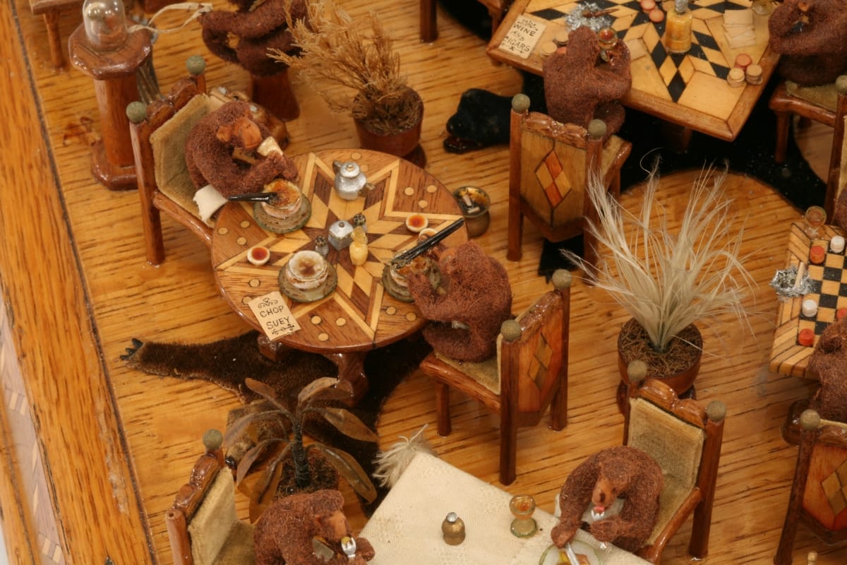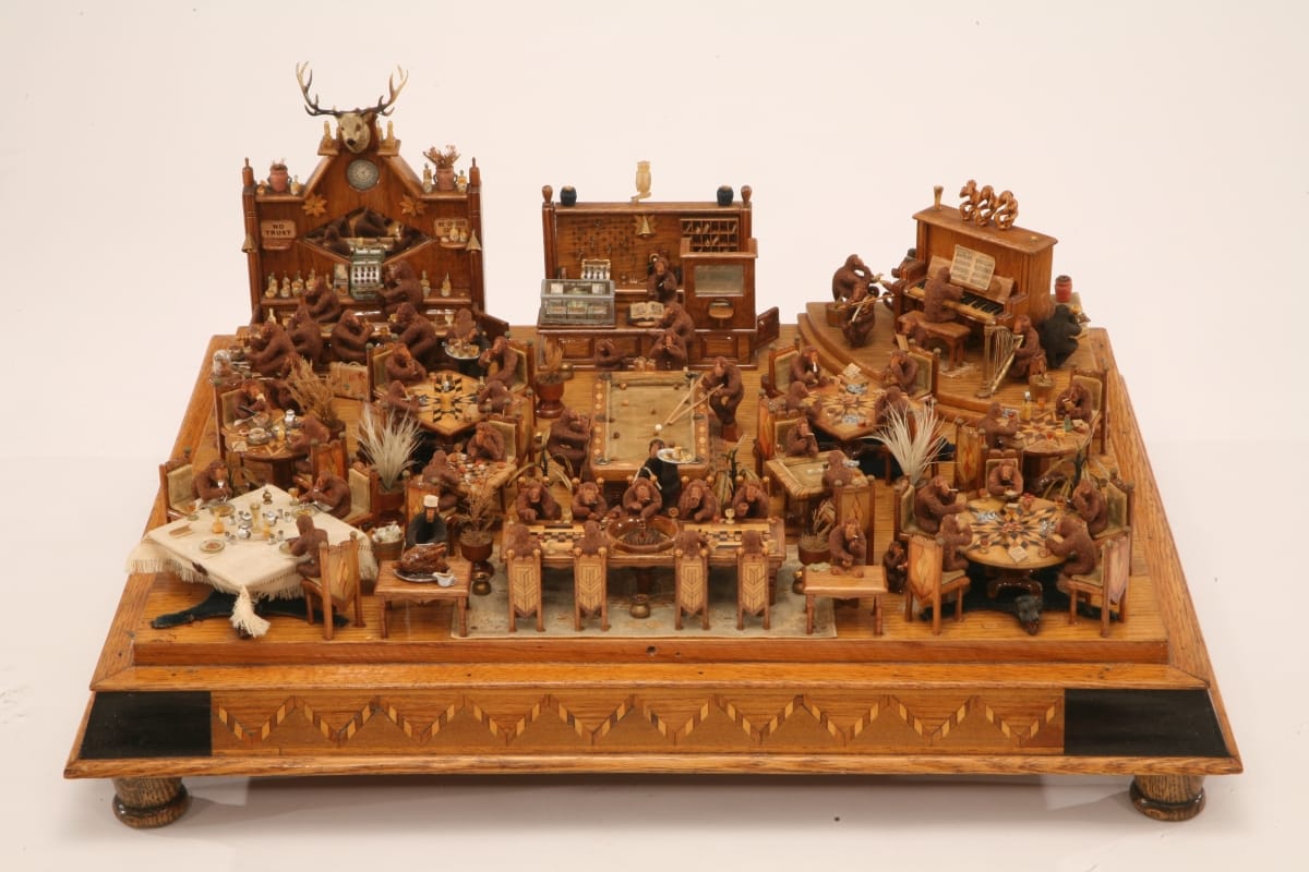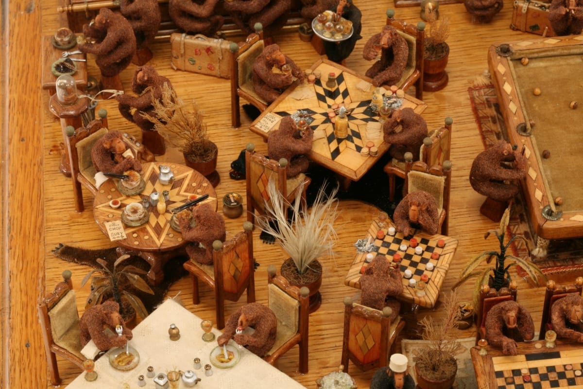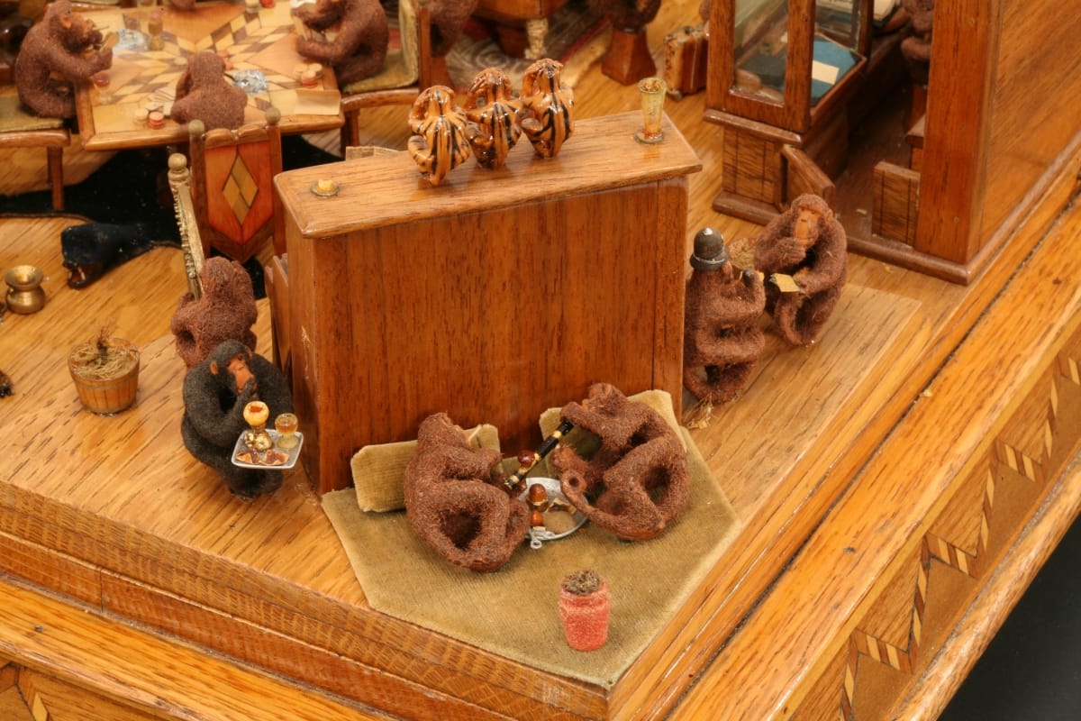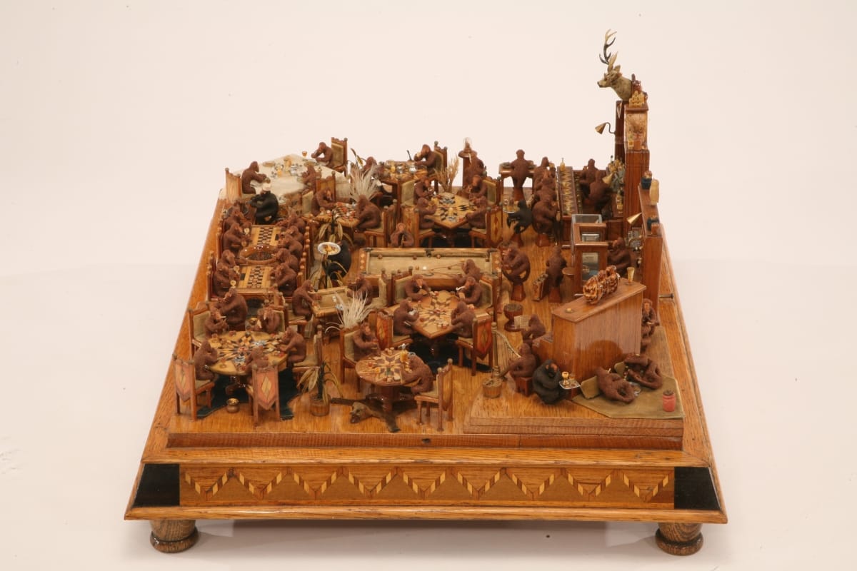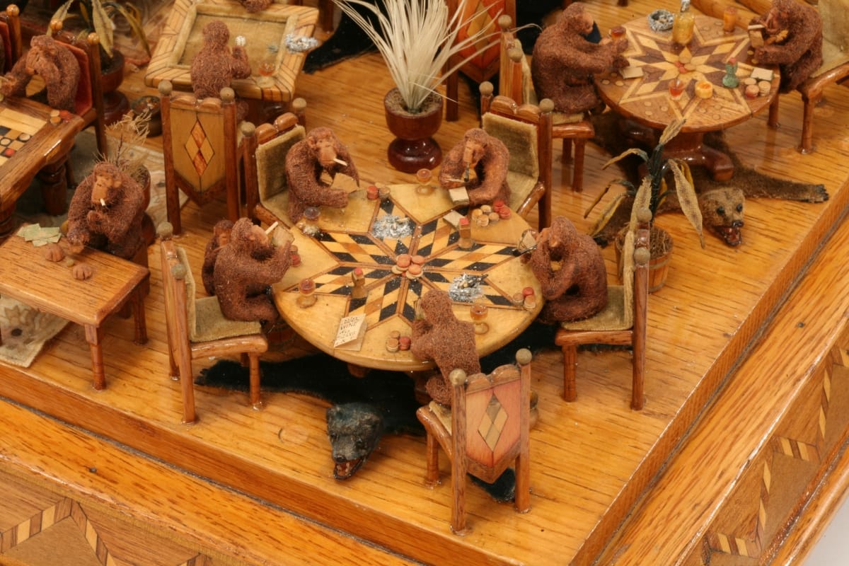 In 1915, Patrick J. Culhane, an inmate at the Massachusetts State Prison, presented this diorama to Henry Ford. Culhane depicted monkeys engaging in activities he believed lead to the downfall of many prisoners, such as gambling and drinking alcohol. Ford, interested in the man who produced this elaborate work, probably secured Culhane's release and gave him a job at the Ford assembly plant in Cambridge, Massachusetts.