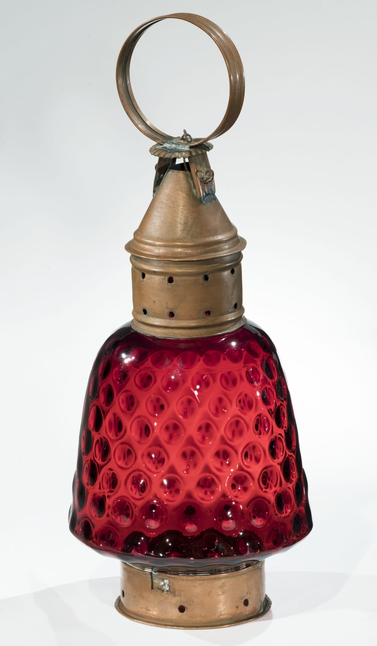 Traditional make-dos are useful and precious objects that broke during their working lives. Their owners felt compelled to restore or repurpose these objects in a variety of ways. This lantern has a pressed glass chimney--that was originally a vase.