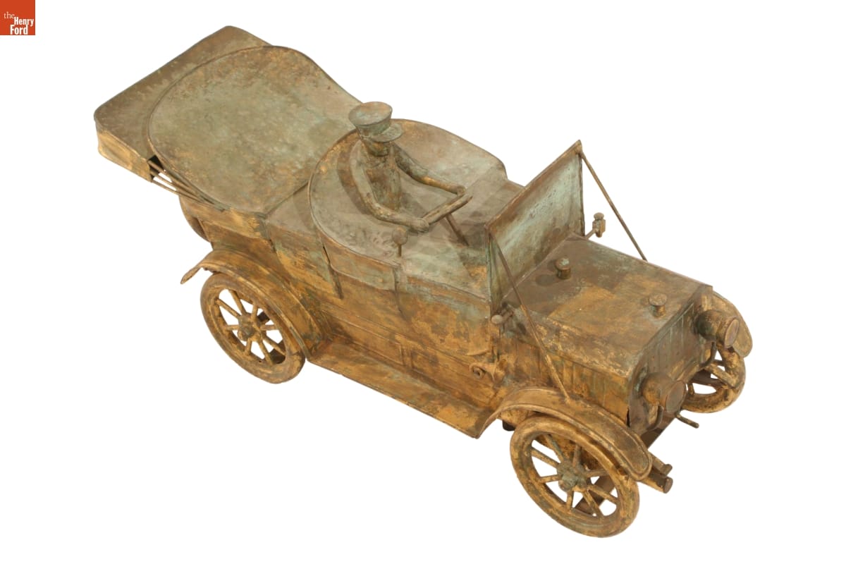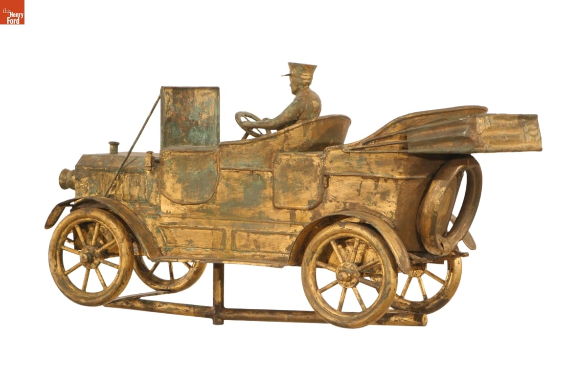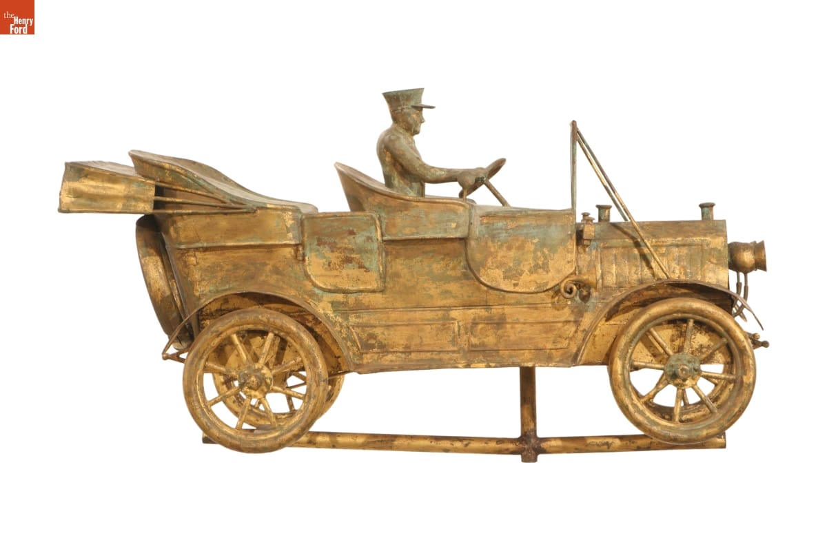 Weathervanes point into the direction of the wind. This helped viewers anticipate weather changes before local forecasts became common after 1920. Functional vanes required a basic pointing device and directional arms, but manufacturers added decorative elements, or ornaments, to appeal to consumer interests. Changing transportation technologies became popular symbols of modernity during the late-19th and early-20th centuries.