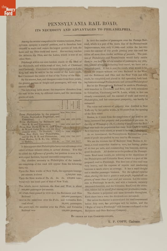 Description beneath: A copy of the printed broadside issued in 1847 for circulation among the business men of Philadelphia and urging the necessities and advantages of the Pennsylvania Railroad, with arguments designed to win support for the project./ Cornerstone document of the present Pennsylvania Railroad System. No other copy bibliographically recorded. Signed by T.P Cope, Chairman of the Commissioners./ Published in Philadelphia. Date: 1847.