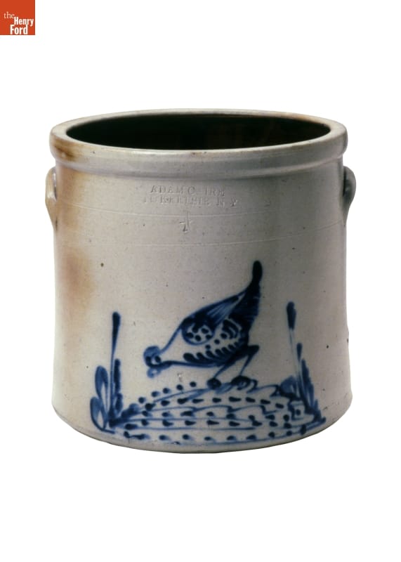 This crock was made of a durable, leak-proof pottery called stoneware, shaped on a potter's wheel. The orange-peel-like outer glaze was created when the potter threw handfuls of common rock salt into a white-hot kiln during the piece's firing. Salt-glazed stoneware pieces were decorated with an amazing array of designs, including the pecking fowl on this piece.