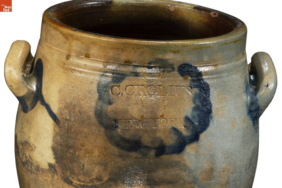 Clarkson Crolius's New York City pottery produced this durable, leak-proof stoneware jar in the early 1800s. Its orange-peel-like outer glaze formed when the potter threw handfuls of common rock salt into a white-hot kiln during the piece's firing. Clarkson Crolius was the grandson of William Crolius, a German immigrant who founded the family pottery businesses in 1730.