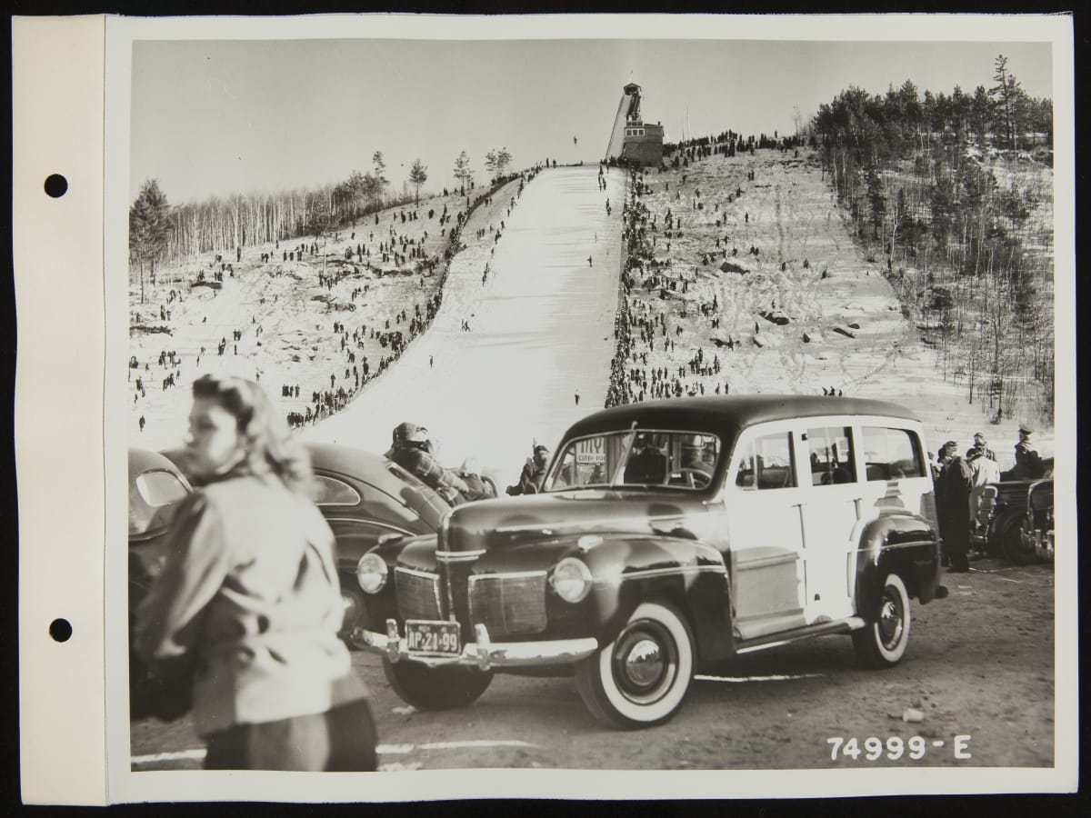 Skiers at a tournament near Iron Mountain, Michigan, made a fine backdrop for this 1941 Mercury station wagon. Ford Motor Company built wood bodies for Ford and Mercury station wagons at a factory in Iron Mountain until 1952, when the automaker adopted all-steel wagon bodies.