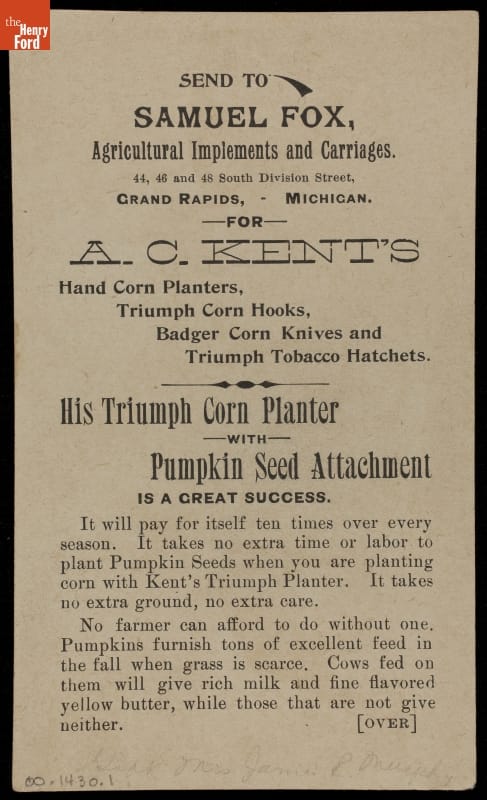 Pumpkins and corn are good companion crops in the garden, as the large pumpkin leaves limit weed growth and keep soil moist. This humorous trade card conveys several important selling points--that the planter was easy to use, that pumpkins were a product that could be sold directly to customers, and that they could also be used for livestock feed.