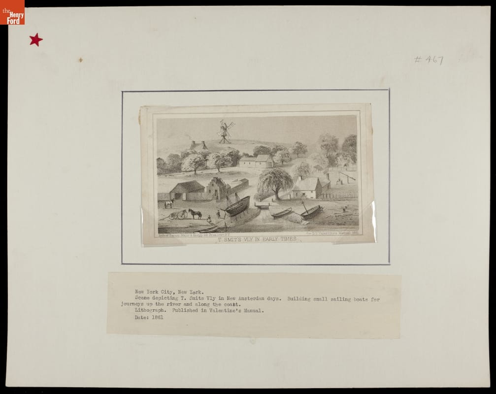 Description beneath: New York City, New York. Scene depicting T. Smits Vly in New Amsterdam days. Building small sailing boats for journeys up the river and along the coast. Lithograph. Published in Valentine's Manual. Date: 1861.