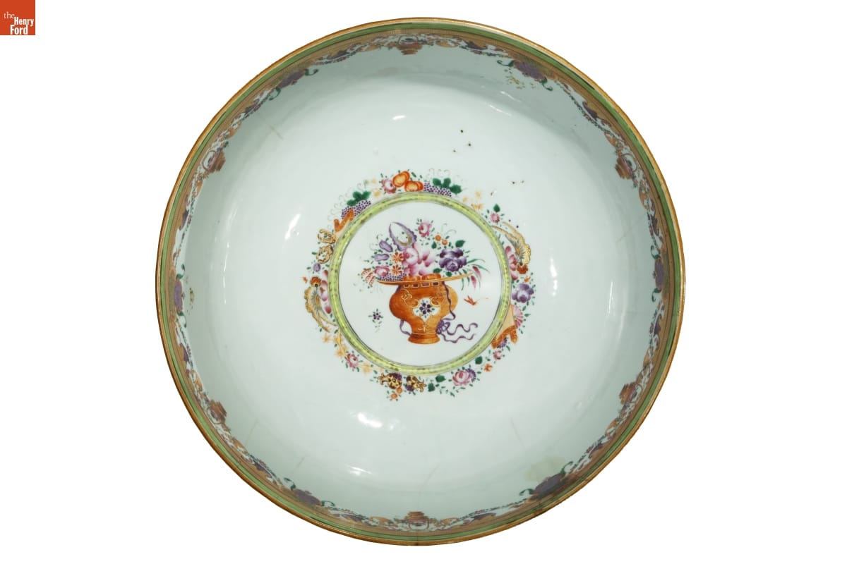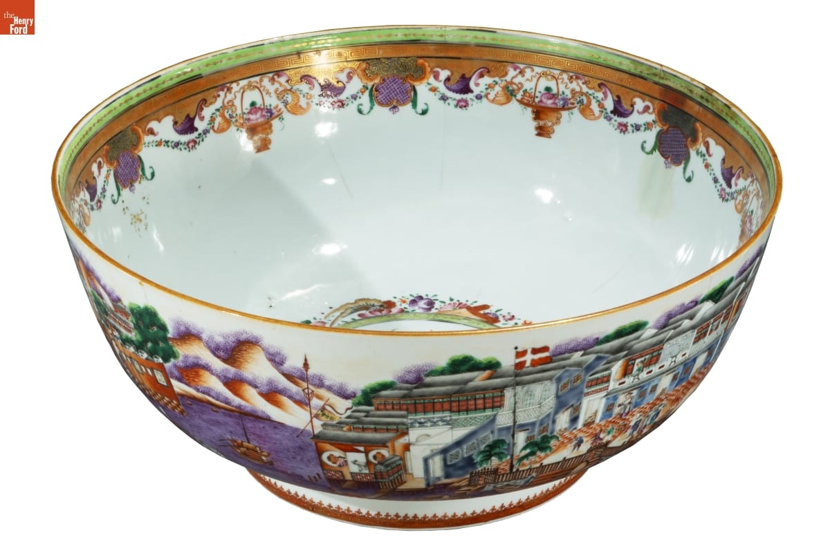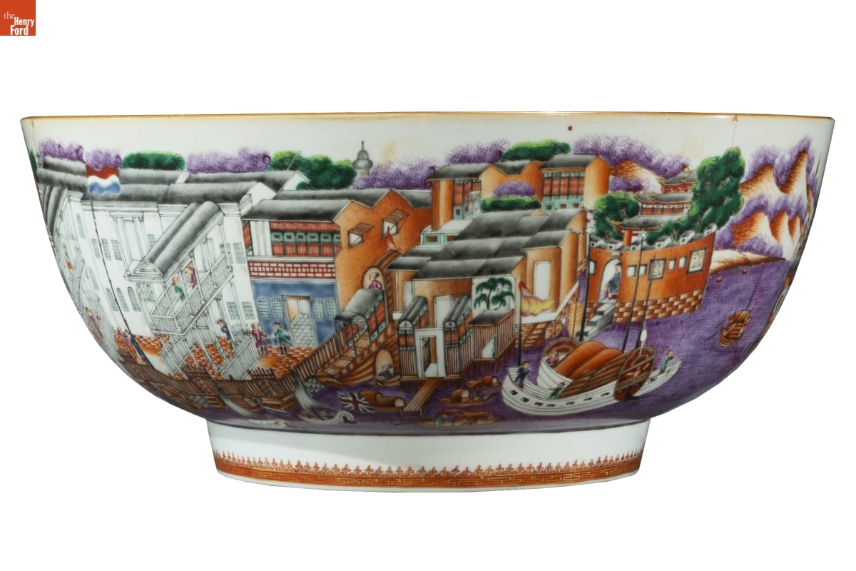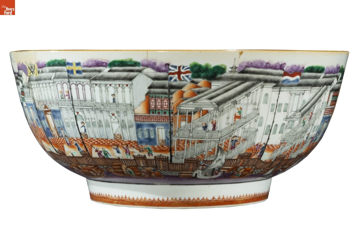 This "Hong" bowl shows a panoramic view of foreign merchants' offices, warehouses, and living spaces in Guangzhou, China, in the late 18th century. Flags of each merchant's nation fly in front of their trading offices. These merchants brought these souvenir bowls back to the West and used them for serving punch. Potters produced this bowl before the newly independent United States established trade with China.