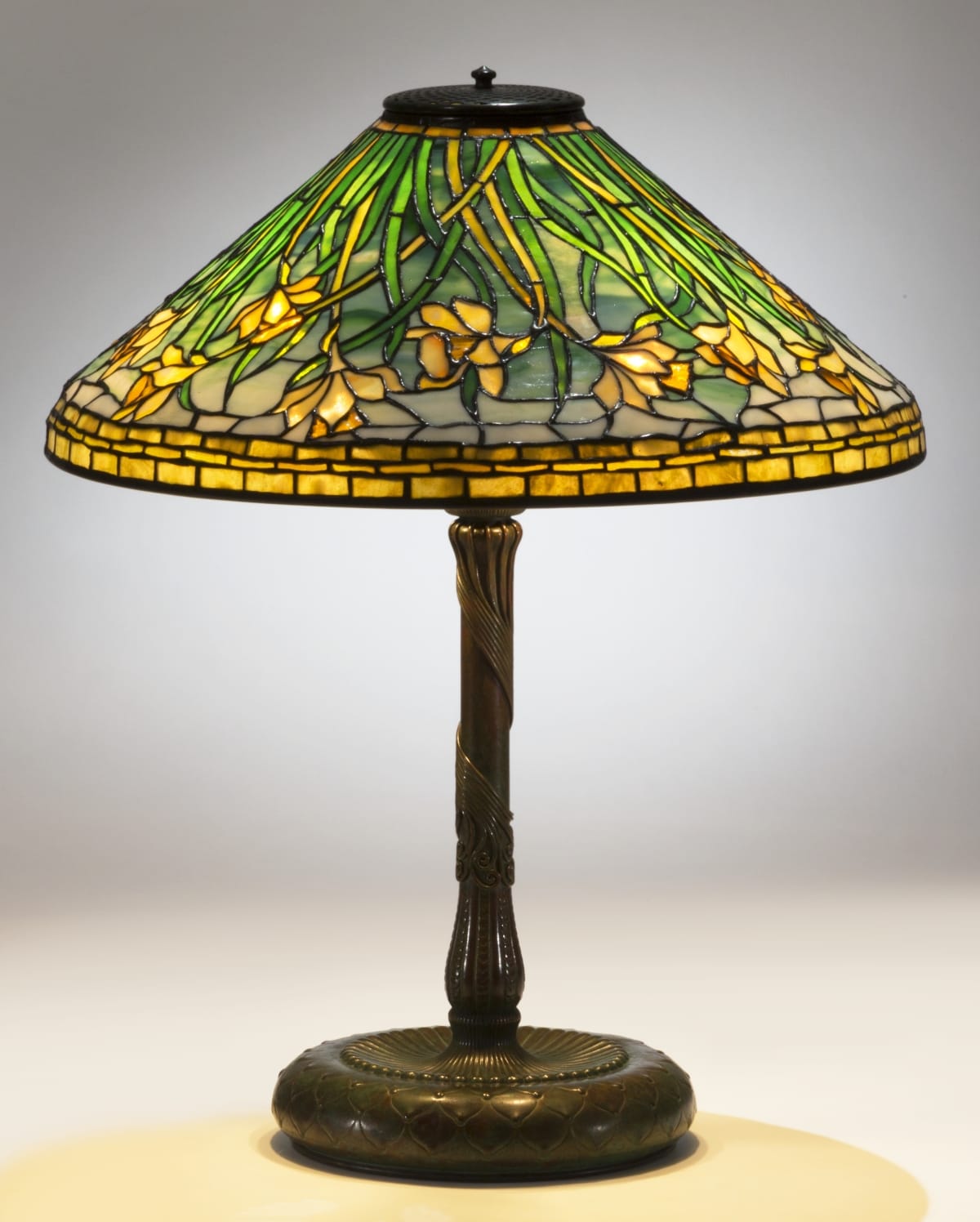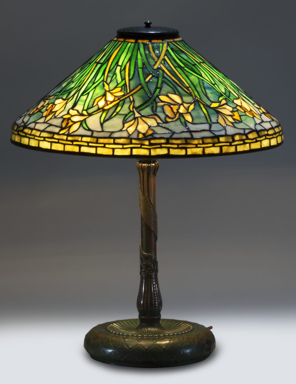 When designer Clara Driscoll created this daffodil patterned lamp for Louis Comfort Tiffany she did not realize that it was the first of a series of floral electric lamps shades, which included Wisteria, Poppy and Laburnum. Driscoll was the leader of a group of female designers known as "The Tiffany Girls", all unmarried women who designed and fabricated decorative domestic wares from desk sets to jewelry.