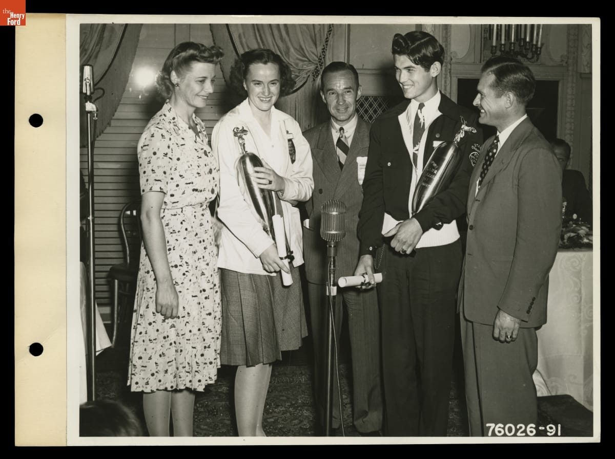 Ford Motor Company created the Good Drivers League in 1940 to promote safe driving habits among high school students. In 1941, boys and girls from 48 states and the District of Columbia came to Dearborn, Michigan, to compete for scholarships and trophies. National champions Patricia Borman and Kenneth Karr stand with Edsel Ford (center), tennis champion Alice Marble, and Indianapolis 500 winner Wilbur Shaw.