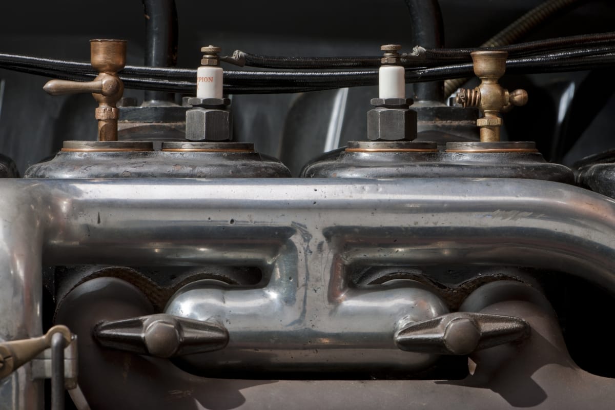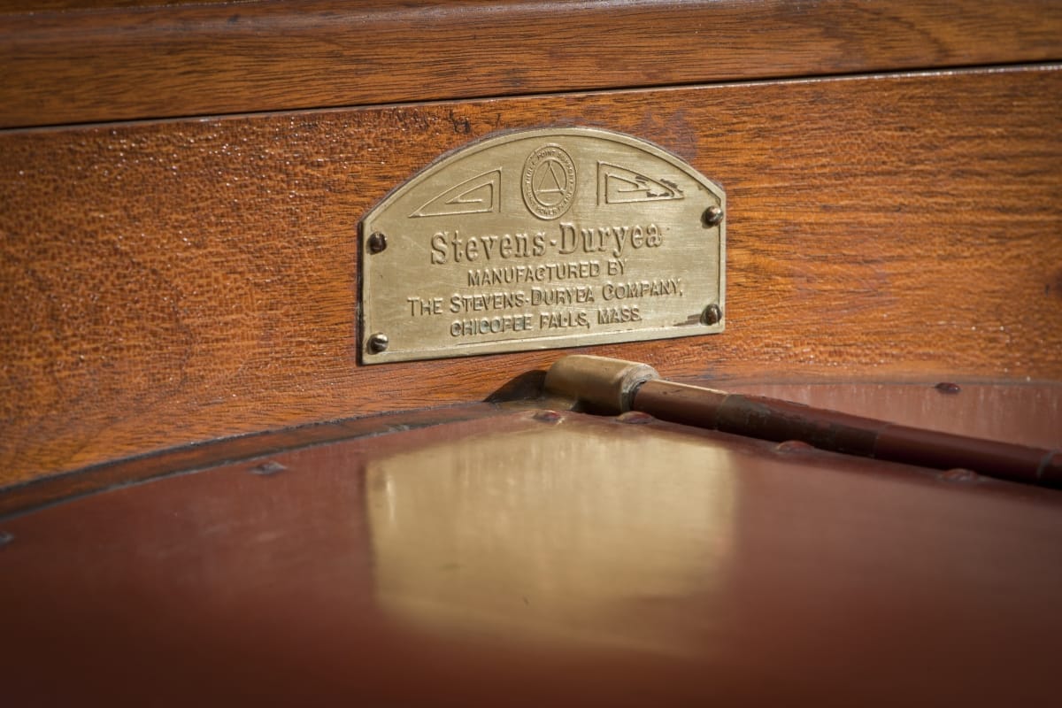 Plate on dash: THREE POINT SUPPORT UNIT POWER PLANT [in circle] STEVENS-DURYEA / MANUFACTURED BY / THE STEVENS-DURYEA COMPANY / CHICOPEE FALLS, MASS. Radiator: STEVENS-DURYEA Lanterns on sides of dash: C.M. HALL LAMP CO. / DETROIT, MICH. U.S.A. / MODEL 144-E (in diamond)